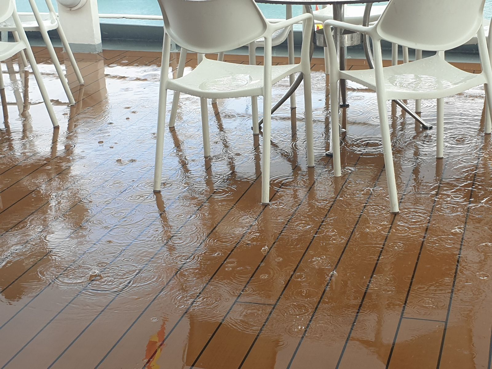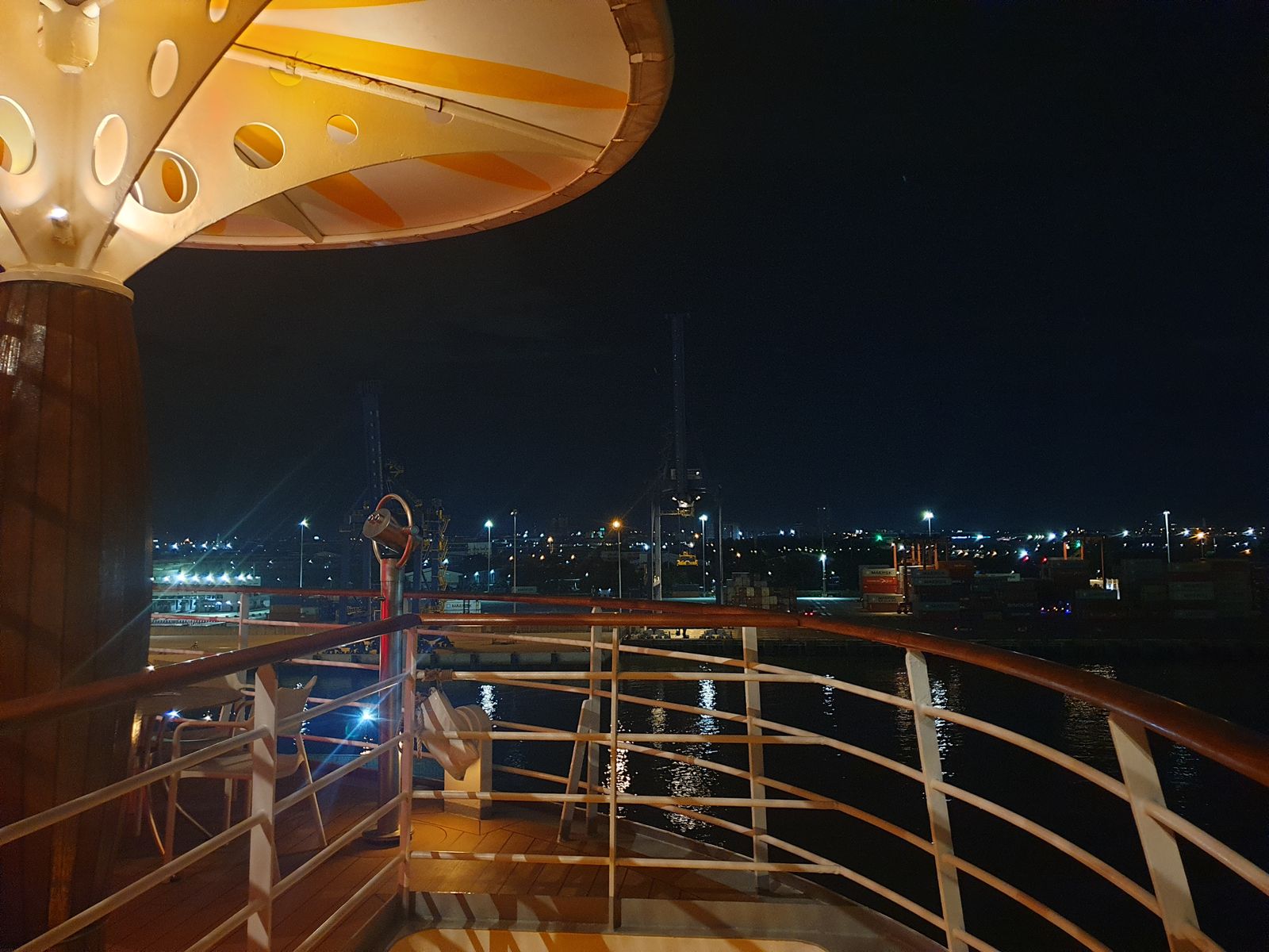 Der Wecker klingelt, rasch aufstehen, frühstücken und dann wird die Kabine geräumt. Der Koffer steht im Terminal, der Rest ist im Bordtrolli und den haben wir dabei. Safe ist auch geleert. Nochmal geschaut, ob nicht irgendwo noch was herumliegt und zack, Kabinentür zu und hoch aufs Pooldeck. Wir haben ja noch massig Zeit bis heute Abend.