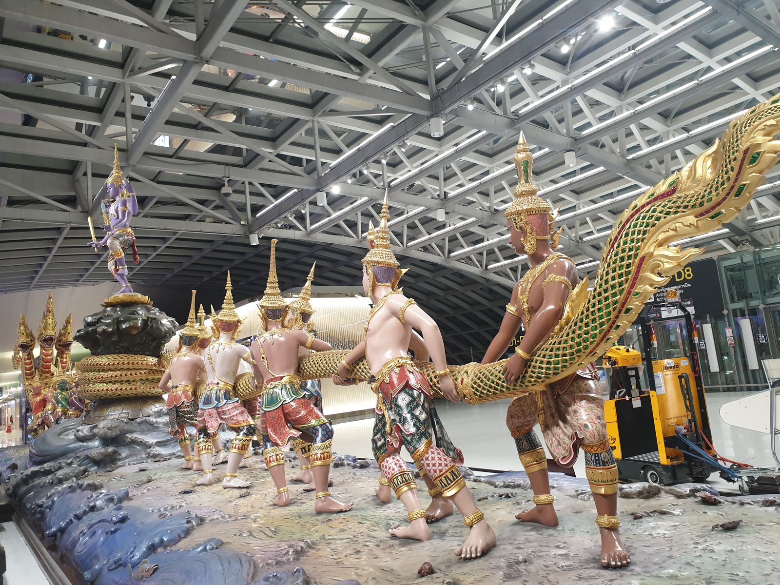 Die Bus stehen bereit und ab geht es zum Flughafen in Bangkok. Es ist still im Bus und einige Leute sind eingeschlafen. Am Flughafen das bekannte Bild, lange Schlangen beim Check-In, Kofferabgabe, Passkontrolle und kurz vor 24 Uhr sehen wir den bekannten Drachen wieder.