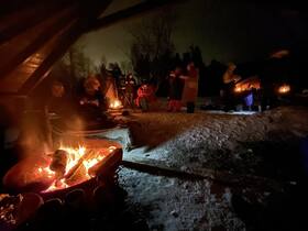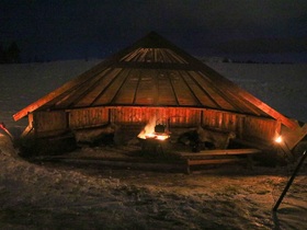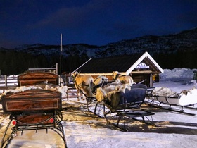Wir sind um 19:40h auf dem kleineren Parkplatz am Schiff abgeholt worden. Insgesamt waren wir 16 Personen. 15 Minuten später dauerte die Fahrt und wir waren bereits auf der Farm. Um ca. 20:45h waren wir mit insgesamt 4 Pferdekutschen losgefahren. Wir fuhren durch den Wald und entlang des Alta-Flusses, die wir aber wegen der Dunkelheit nicht sehen konnten. Die Kutschfahrt dauert ca. 70 Minuten. Anschließend waren wir an einer halboffene "Tippizelt" aus Holz. Zwei Lagerfeuern luden uns zum Aufwärmen ein.