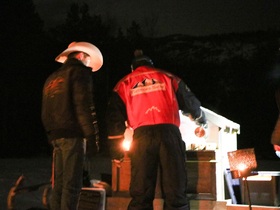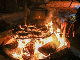 Für die Hauptspeise benötigten die "Rancher" beide Lagerfeuer. Auf der einen Feuerstelle wurden die Pitas in der Alufolie geröstet. Auf der zweiten Feuerstelle wurde die Finnbiffs (norweg. Nationalgericht) vorbereitet. Finnbiff ist ein geschnetzeltes Rentierfleisch mit süßem braunem Ziegenkäse. Diese wurden dann in die Pitas gefüllt. Finnbiff hatte ich 2020 schon probiert und fand sie damals schon sehr lecker!