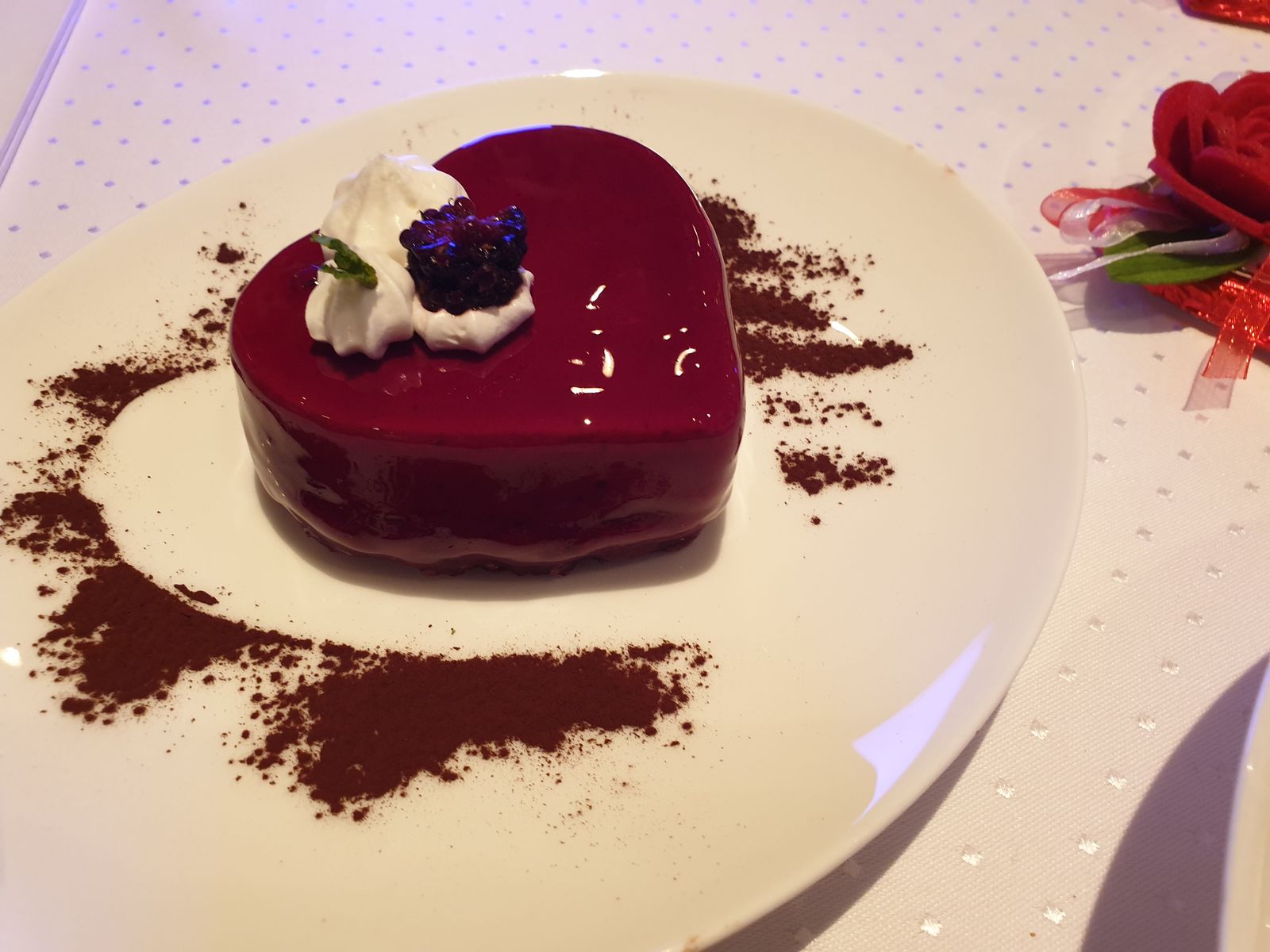 Der Champagner perlt in den Gläsern, die Vorspeisen stehen hübsch angerichtet auf langen Tischen und natürlich gibt es passend zum Valentinstag eine pinkfarbene Beleuchtung der Eisfigur. Der Pianist sorgt für musikalische Untermalung und ich muss zugeben, die Stimmung ist doch recht romantisch. Restaurant Manager Leon Walk stellt kurz die Crew vor, die für uns fleißig war und sie bekommen Applaus von uns. Tolle Arbeit!!!! Die Leinen werden gelöst, Sail away erklingt und wir lassen St. Maarten hinter uns. Im Rossini warten wieder Köstlichkeiten, die dekorativ serviert werden – auch die Farbe Pink ist vertreten und wir bekommen ein Herz geschenkt.
