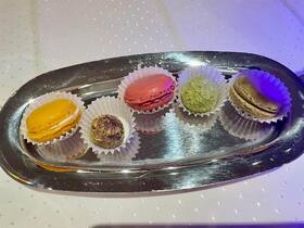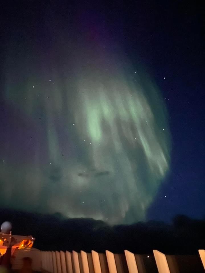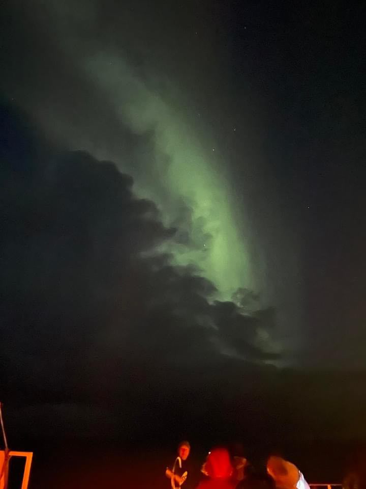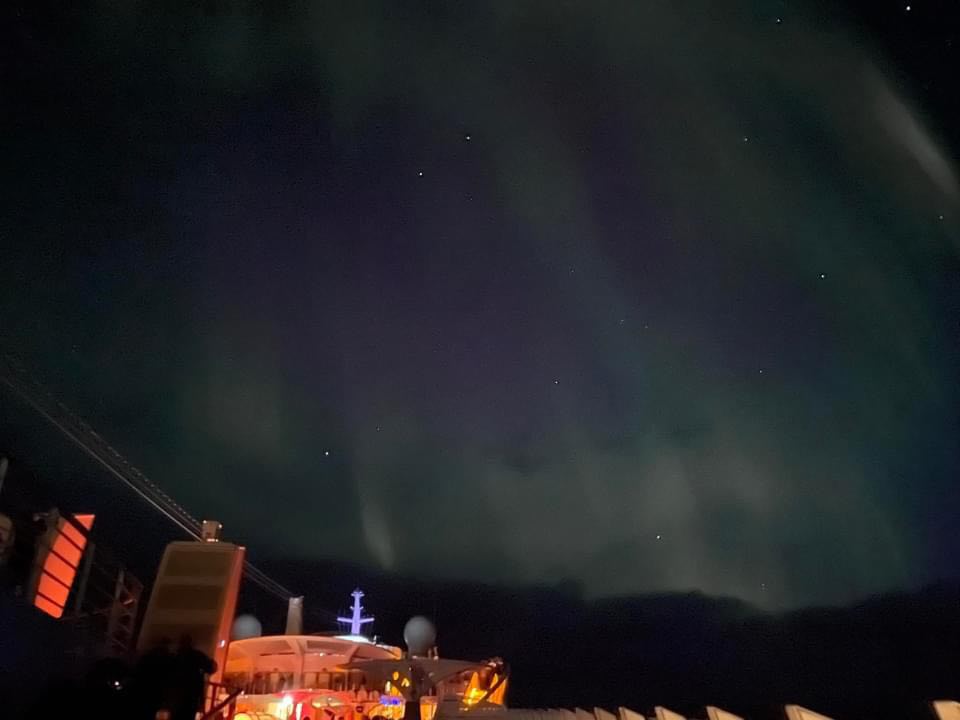 Weiter ging es in Richtung Rossini, wo uns erst ein Sorbet, später ein Fischmenü und eine Nachspeise serviert wurden. Dazu einen guten Wein, zum Abschluss einen Grappa und noch ein Espresso mit Pralinen. Wir waren eine sehr unterhaltsame Gruppe! Nach der Tour hatten wir uns dann gemeinsam entschieden direkt in der Haifischbar weiter zu machen. Wir konnten gerade mal einen Schnaps mit Tabasco & ein Cocktail austrinken, da kam die Durchsage von Kapitän Felix Rothe, dass Polarlichter gesichtet wurde. Also hoch über Anytime Bar nach draußen. Wir sahen sehr viele und ungewöhnliche breitgefächerte Polarlichter! Der Abend war aber noch nicht vorbei! Wir sind alle auf den Geschmack gekommen, den weißen Glühwein zu probieren. War richtig gut und sehr lecker! Die Polarlichter konnte man lange genug zu sehen. Also immer wieder rausgegangen und bestaunt! Es war ein fantastischer Abend! Irgendwann kurz nach Mitternacht war dann für alle Schlafenszeit …