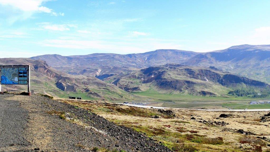Morgens um 7 war die Welt noch in Ordnung – richtig in Ordnung! Wir sprangen früh aus den Federn und nach dem Frühstück machten wir uns auf den Weg zu der Mietwagenstation. Zu Fuß durch ein langweiliges Industriegelände. Es zog sich hin … aber wir kamen wie immer an. Nach kurzer Zeit saßen wir in einem Suzuki Ignis, der uns dank Tante Guggels Draihf schnell durch Reykjavik und nach Verlassen der Stadt auf die Ringstraße 1 brachte. Keine Häuserzusammenballungen mehr. Vor uns Grün in unterschiedlichen Tönungen. Hügel, Berge. Wir mittendrin. Dann begannen auf der Hochebene Hellisheiði die Lavafelder. Vorwiegend anthrazitgrau, doch vielfach nach Jahrtausenden mit Flechten und Moosen bewachsen. Vorbei am Kraftwerk Hellisheiði, das wir vor Jahren bei strömenden Regen besuchten.
