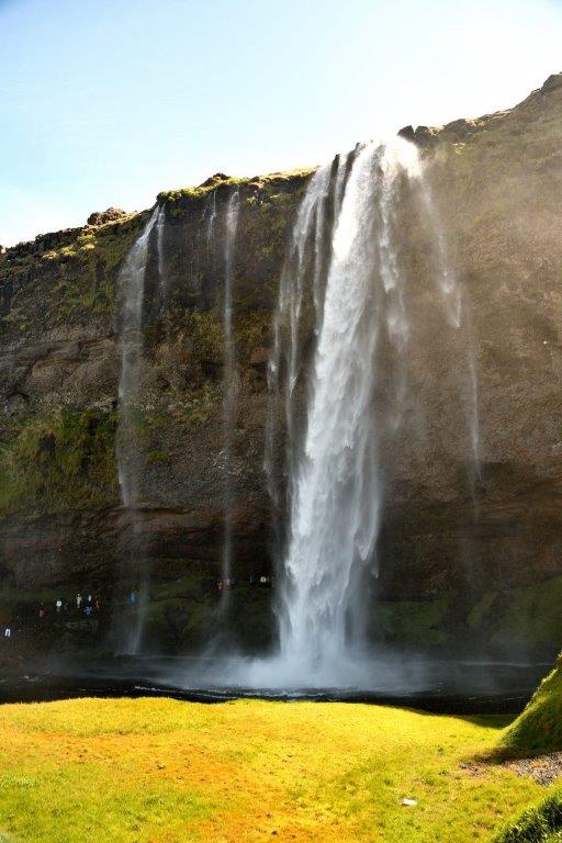 Auch von uns, die sich langsam näherten. 66 m erschienen uns nicht sehr hoch. Woher kam das Wasser? Von den Ausläufern des Gletschers Eyjafjallajökull. Könnt Ihr Euch noch an den sich unter ihm befindlichen gleichnamigen Vulkan erinnern, der 2010 nach seinem Ausbruch einen Teil des europäischen Flugverkehrs lahm legte?! Nicht an diesem Tag – der blaue Himmel sollte nicht von Aschewolken beeinträchtigt werden.