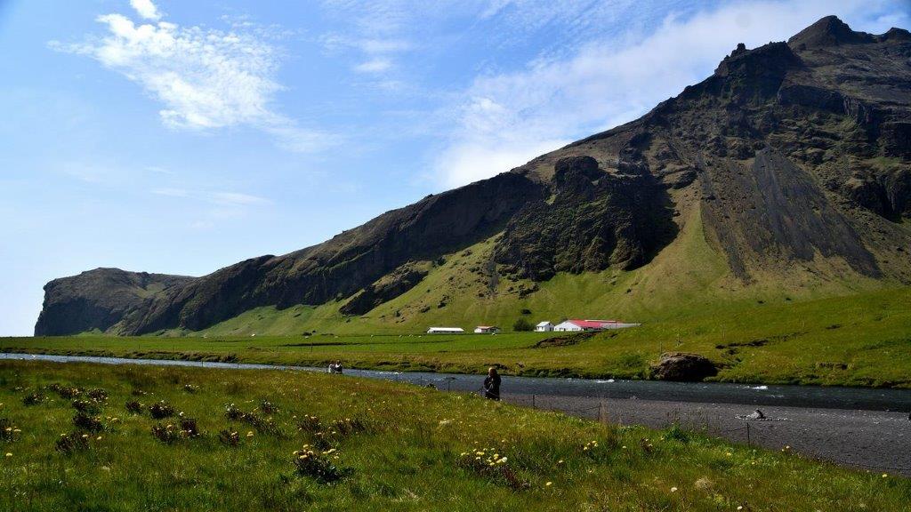 Vor uns ein steiles Bergmassiv. An dessen Fuße ein Anwesen. Dann zwischen herrlichen Wiesen, die mit ungewohnt dicken Löwenzahnblüten besprenkelt schienen, der Fluss Skógá. Aber wo war der Wald? Der gehörte eigentlich zum (übersetzt) Waldwasserfall, dem Skógafoss.