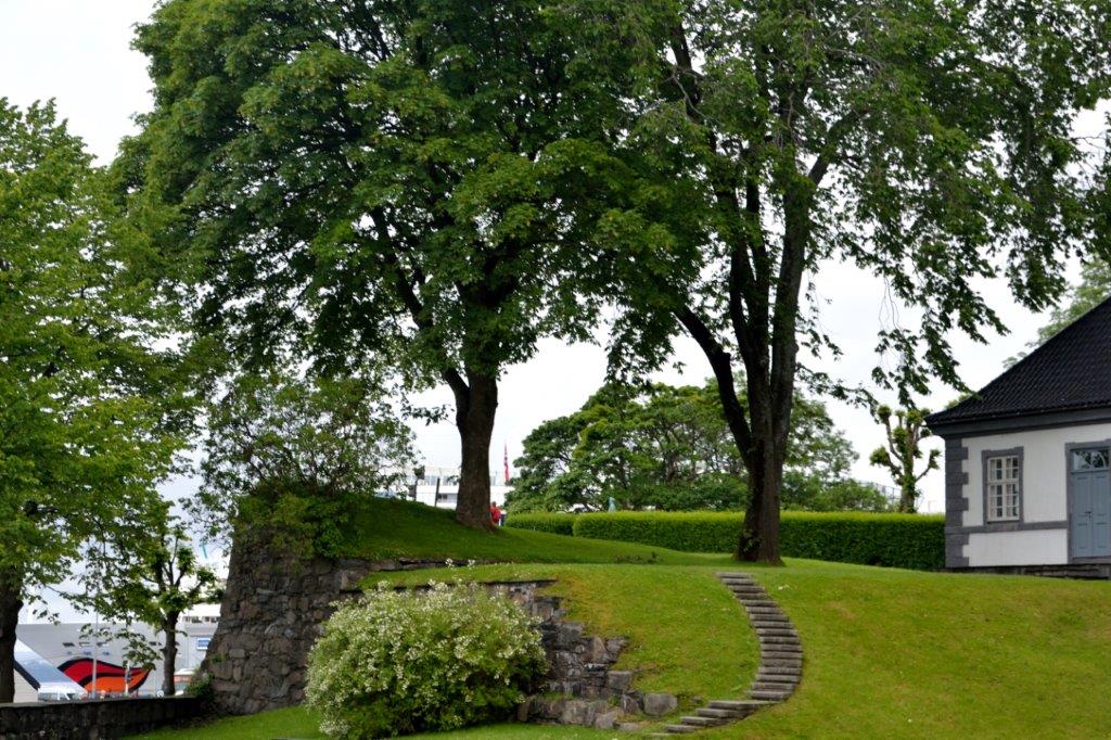 Mit diesem Gedanken verschwanden wir im Restaurant. Ein ausgiebiges Frühstück begann – wir benötigten die Stärkung für die vor uns liegenden Kilometer. Dann war es so weit – runter von unserer AIDAluna und los. Wir hatten es nicht weit bis dorthin, wo in Bergen die Musik spielte. Aber ein kurzer Blick Richtung der drei weißen Schiffshotels musste sein … bevor wir nach einigen Minuten die Festung Bergenhus erreichten, deren Ursprünge aus dem 12. Jahrhundert stammen. Mit Sicherheit nicht das alte Steinhaus, in dem aktuell ein Café untergebracht ist. Der in den vergangenen Jahrhunderten immer wieder erweiterte Festungsbereich ist weitläufig. So konnten wir ein wenig länger zwischen Grün und Stein spazieren und uns die wesentlichen Festungsteile anschauen. Z.B. die Håkonshalle, deren Rückseite sich hinter einem mächtigen Baum versteckte.