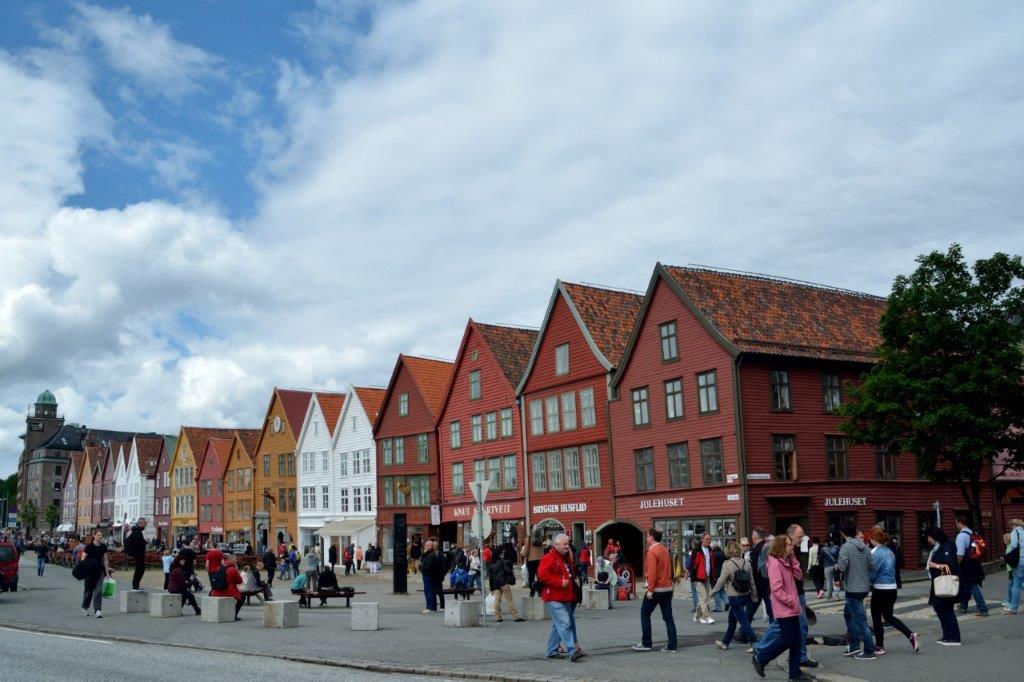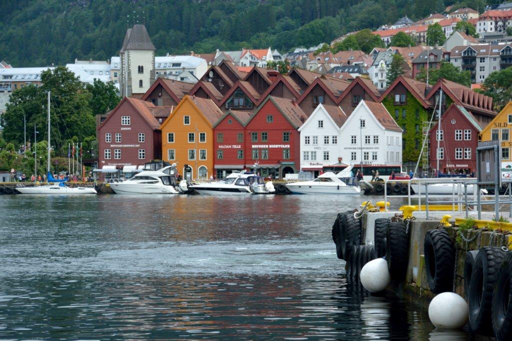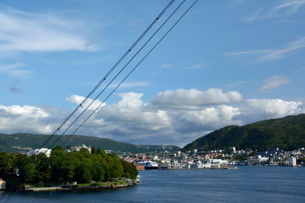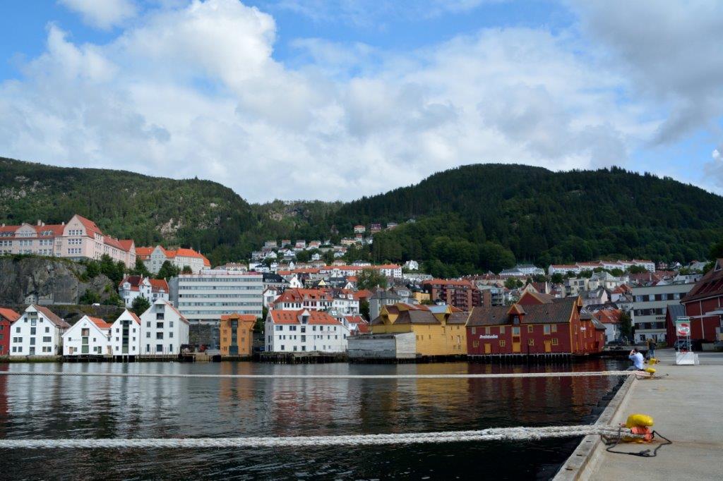 Wir beschlossen, der Wasserlinie zu folgen und nicht sofort das bestimmt mit Touristen der angekommenen Schiffe überlaufene Hanseviertel Bryggen zu besuchen; wir verschoben es auf den Nachmittag. Auch den Fischmarkt passierten wir ohne größere Pause – er sollte das Ziel für unseren Mittagsimbiss werden. Wir umrundeten Vågen und staunten immer wieder über die Ausblicke auf Wasser, die Vågen begrenzenden blitzsauberen Gebäude und die Hügel im Hintergrund - auf der Halbinsel Nordnes.