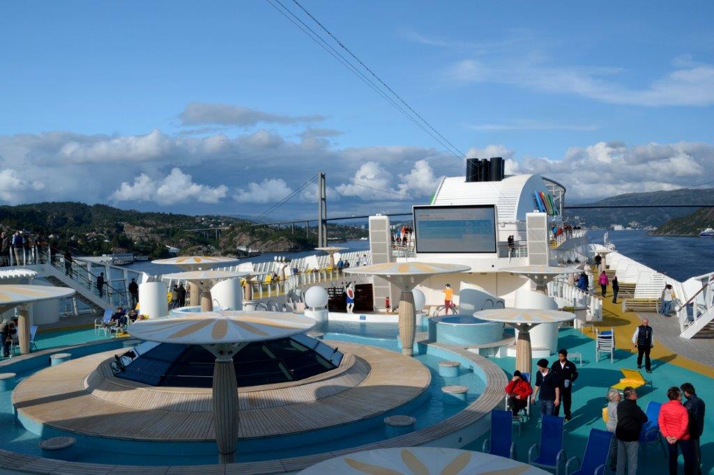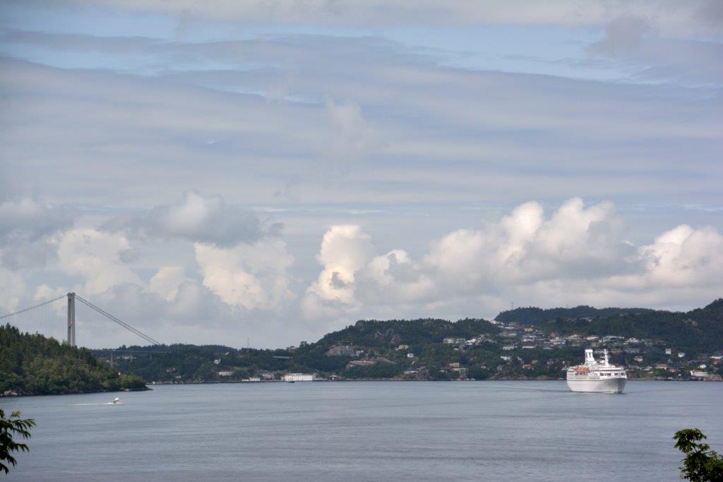 Nun aber zurück zu den beiden anderen Schiffen. Die AIDAcara hatte bereits angelegt; die Seabourn Quest parkte gerade rückwärts ein. Schön vorsichtig, schön langsam. Es klappte zur Zufriedenheit aller – wir hörten keine Klagen … Ein Blick nach oben – gen Himmel. Schön, was wir sahen. Es gab Hoffnung. Ein großer blauer Fleck. Ganz weit hinten – über der Askøy Brücke – gewaltige Wolkenberge. Sie ließen uns richtiggehend kalt … über uns hatten wir den Himmel, den wir wollten …