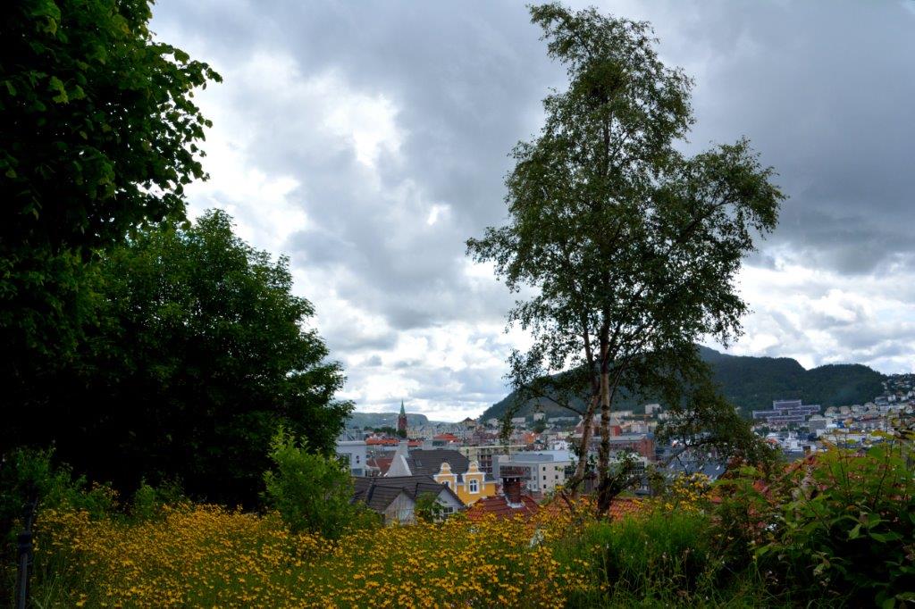 Wir lösten uns kurz von den Schiffen. Mal sehen, was auf dem Land zu sehen war. Zunächst auf der anderen Seite der Bucht und des Stadthafens Vågen die Nykirken, umringt von modernen Zweckbauten. Dann vor uns die Håkonshalle und leicht abseits der zum Fløyen gehörende Hügel. In grüner Baumpracht, aber stark durchsetzt mit weißen und auch vielen bunten Häusern.