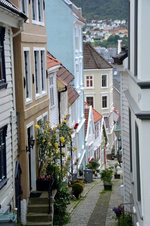 Von hier aus kamen wir nach wenigen Metern zu einer der schönsten Holzhausviertel Bergens. Rund um die Straße Haugeveien. Kopfsteinpflaster. Steil ging´s nach unten.