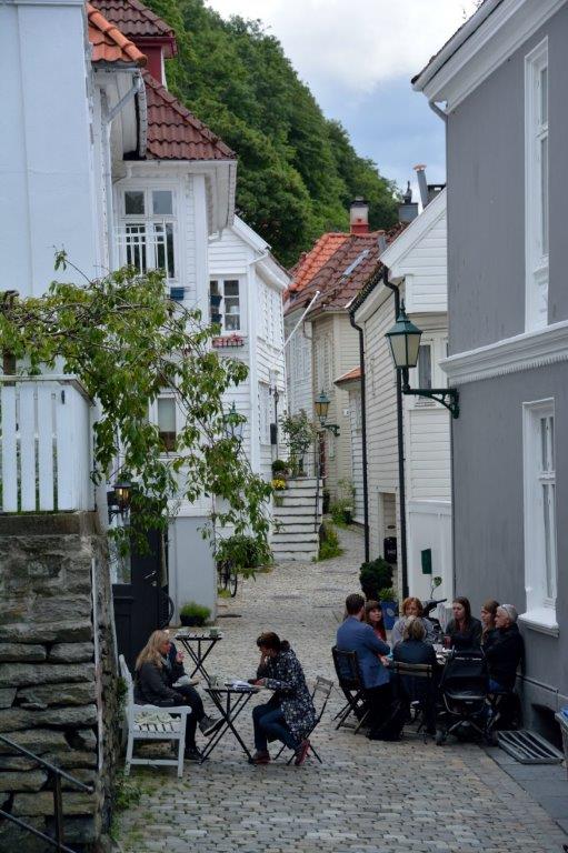 Die kreuzförmige Nykirken baute sich vor uns auf. Neue Kirche? So neu sah sie nicht aus – geweiht wurde sie im Jahre 1622. In Bergen gibt es viele Kirchen, die älter sind. Die in den letzten Jahrhunderten Feuerbrünsten zum Opfer fielen und wieder aufgebaut wurden. So auch die Nykirken, die 1764 in der jetzigen Form errichtet wurde. Als damals neueste Kirche Bergens, also als Nykirken. ogisch, dass wir sie kurz besichtigten. Einfach und klar. Eben norwegisch. Schade, dass man den Kirchturm nicht besteigen durfte. Die Aussicht hätte uns bestimmt gefallen! Dann konnte es also nur heißen: weiter! Und zwar immer in der Nähe des Wassers. Dort stießen wir auf die kürzeste Straße Bergens. Oder eher Gasse. 16 m lang. So gerade von uns zu bewältigen … Bekketomten hieß oder heißt sie. Oder für die des Norwegischen Unkundigen: „Stelle eines Bächleins“, das vor längerer Zeit dort vor sich hin plätscherte. Schön war´s dort. Und sonnig. So dass sich einige von uns nach den Strapazen der Bewältigung dieser äußerst langen Straße setzten und ausruhten. Wer? Uninteressant. Nein, nicht die Person! Aber wir wollen sie doch nicht in diesem Reisebericht zeigen! Dafür ein Beispiel der norwegischen Holzhausarchitektur. Schöne, saubere Häuser, die uns allen gefielen!
