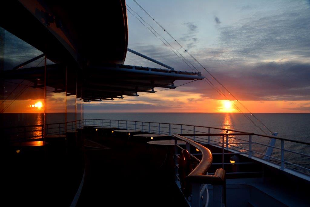Eigentlich eine gute Idee – doch zunächst mussten wir zu Hellis Prime Time. Jens Heinrich Claassen stahl ihm die Show … und wir warteten vergebens auf seine Spitzen über Deck 4 … Anschließend verlagerten wir uns ins Restaurant. Und dann in eine gewisse Bar – ganz oben am Heck. Dort gab es tatsächlich etwas Flüssiges. Außerdem die Ankündigung eines außergewöhnlichen Sonnenuntergangs. Das musste gefeiert werden – mit einer, nein zwei uns gesponsorten Flaschen AIDA-Sekt. Allerdings in dezimierter Runde – der Neunerclan war nicht ganz komplett.