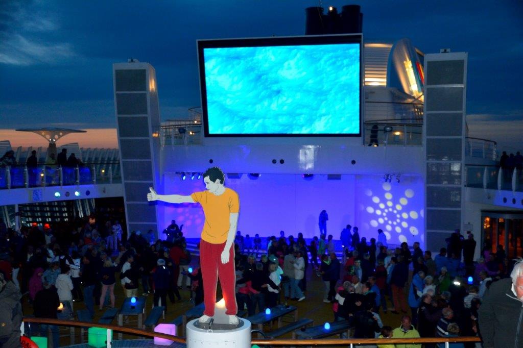 Kapitän Thomas May, General Manager Thomas Fahl und Entertainment Manager Helmut Hertel verabschiedeten sich von uns mit den gewohnten launischen Bemerkungen und statistischen Eckdaten über den nicht zu reichlichen Verbrauch von Futter- und Getränkemitteln. Unsere Mitpassagiere vertilgten während der 17 Tage 21 t Fleisch und Wurst. Damit nicht genug – 7 t Fisch und Meeresfrüchte mussten daran glauben. Das reichte nicht – 5.757 Pizzas füllten die Mägen. Wir als Gesundheitsfanatiker beteiligten uns in erster Linie an 20 t Gemüse und 23 t Obst (davon 4,8 t Ananas). Damit sich die Bauch- und Magentemperatur den Außentemperaturen im hohen Norden anpassen konnte, wurden insgesamt 5.300 l – oder 66.250 Kugeln – Eis verdrückt. Und nun zum Wesentlichen: Irgendwelche Mitreisenden vernichteten 18.800 Flaschen- und 7.371 l Fassbier. Unglaublich … aber natürlich die anderen, nicht wahr, Floppymann?! Damit nicht genug: Weiß- und Rotweinverbrauch waren mit 8.295 l und 8.520 l nahezu gleich. Ich erspare Euch das Rechnen: 14,2 l. Häääääääääääää? Pro Person … es waren schon wieder die anderen … Wir nicht … ehrlich – oder nicht ganz so ehrlich …