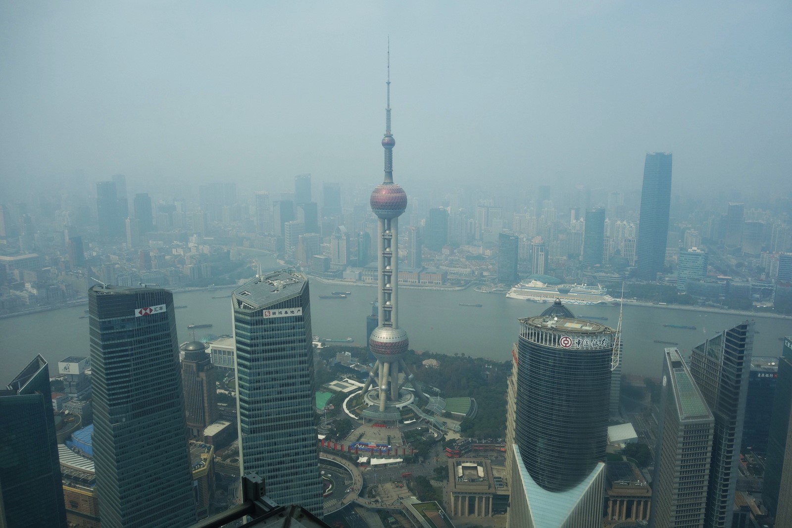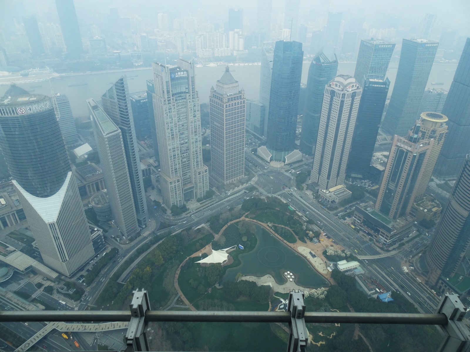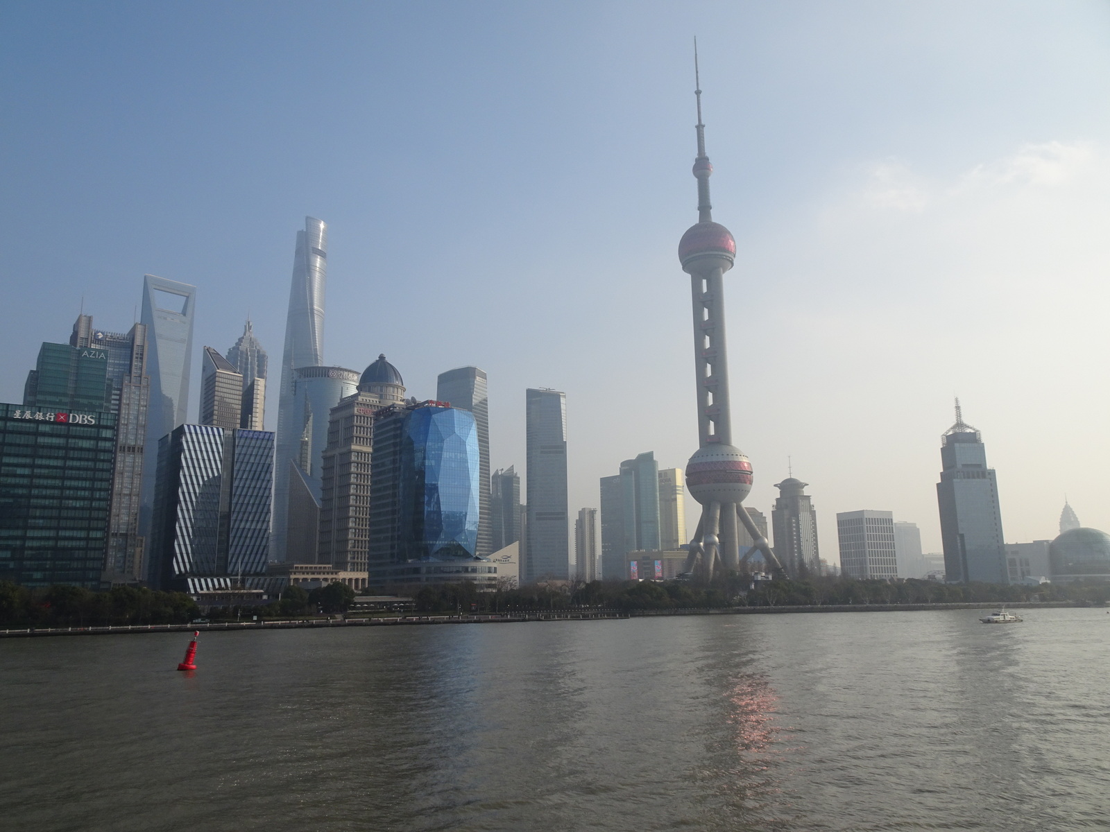 Gesehen haben wir den „kleinen“ mit seinen 421 m ja nun schon im Dunkeln und im Hellen, also von weitem. Jetzt wollen wir rauf. Dazu wechseln wir auf die andere Seite, fahren durch den Tunnel unter dem Huangpu-Fluss, rüber zum Finanzdistrikt Pudongs.