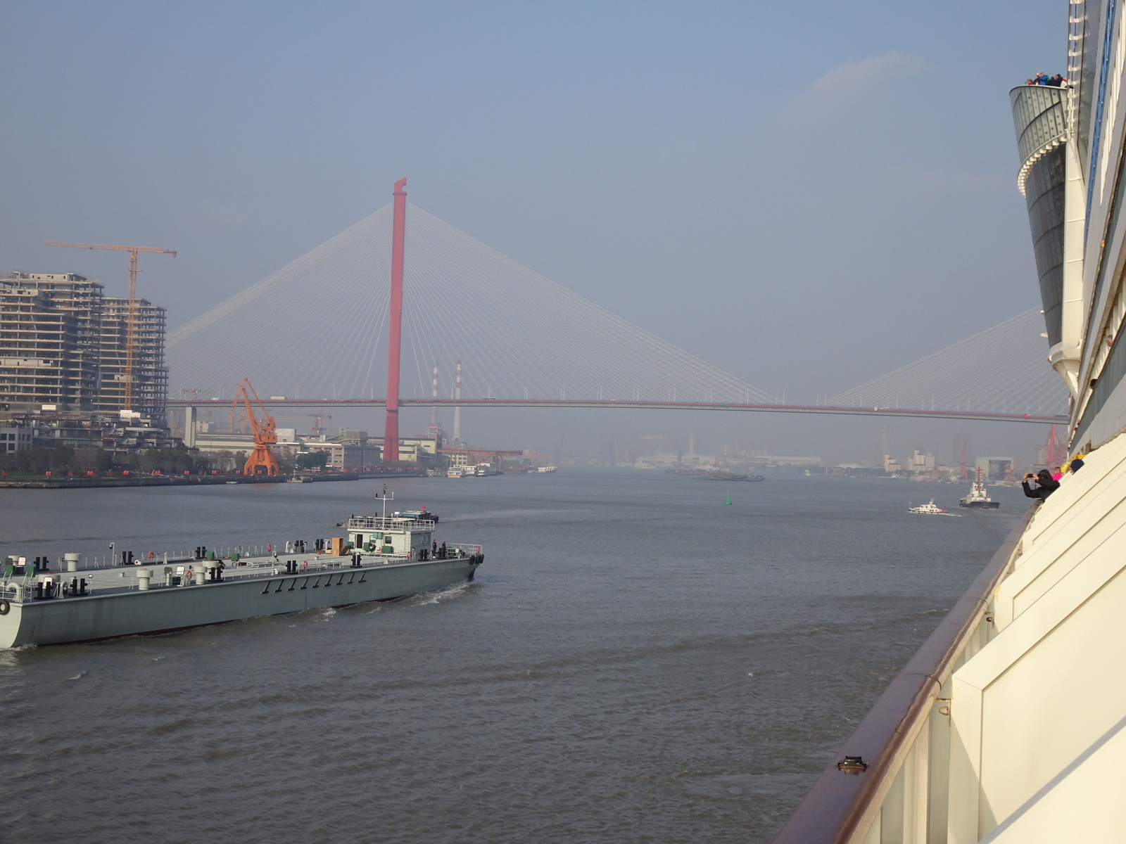 Nun also erstmal 30 km „Flusskreuzfahrt“. Und da kommen immer mehr Hafenanlagen. Kein Wunder, irgendwann muss der größte Containerhafen der Welt ja anfangen. Ob die deshalb eine Städtepartnerschaft mit Hamburg haben? Und traditionell gibt es fast seit jeher über den Kaiserkanal sogar eine Verbindung nach Peking.
