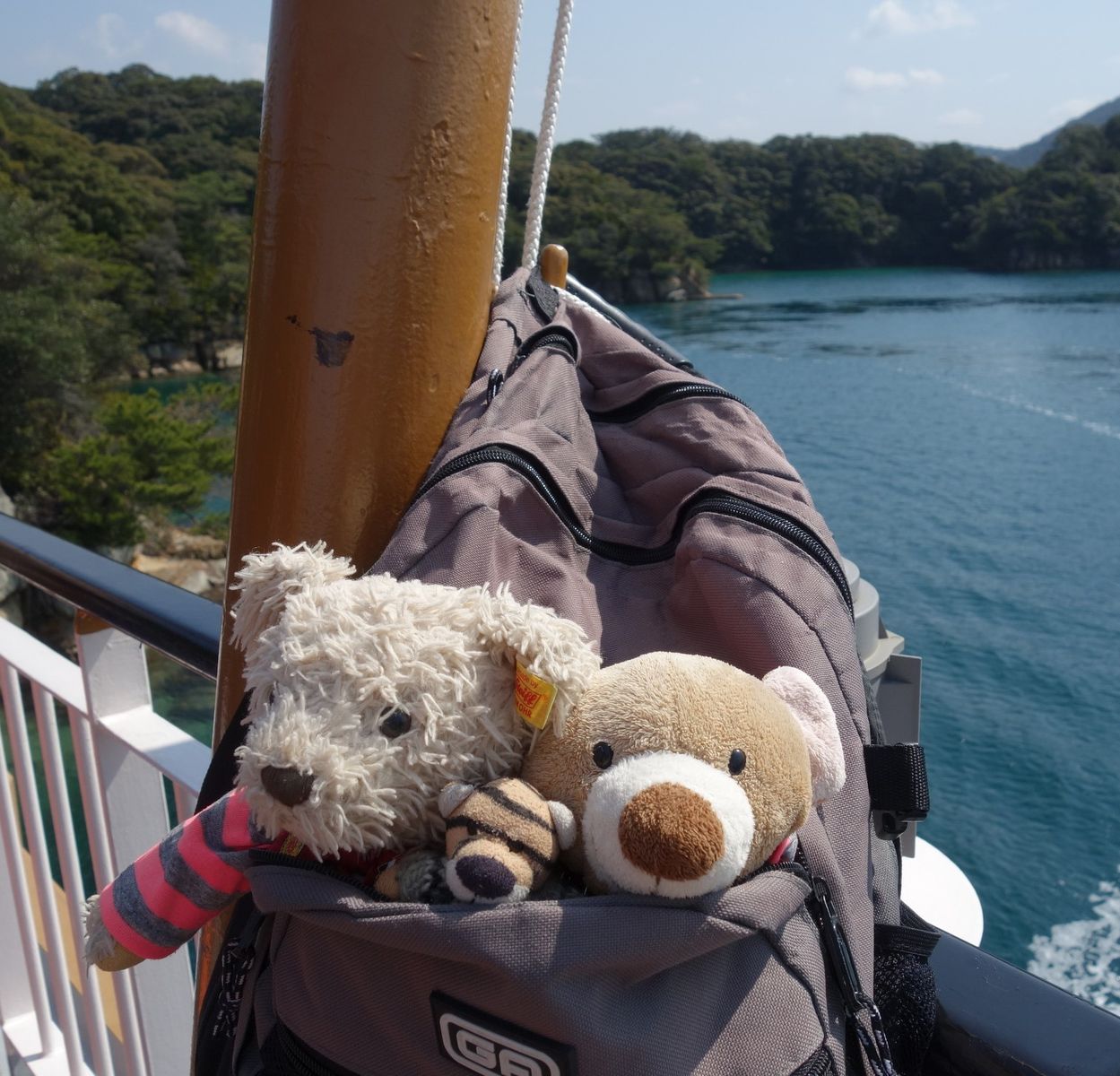 Das Boot ist gar nicht mal so klein und wir ergattern noch einen Stehplatz auf dem offenen Deck am Heck. Wie man sich jetzt freiwillig unten ins Schiff reinsetzen kann, erschließt sich mir nicht. Da hat man doch gar keinen Überblick und sieht maximal die Hälfte. Na ja, solange man sich hinterher nicht beschwert, dass alles Schei… war, dann jedem das Seine. Leute, man muss schon auch aktiv werden, um mal was Schönes zu sehen, gerade jetzt. Da muss man auch mal einen Stehplatz in Kauf nehmen. Oder so klein sein wie wir, dann hat man sogar einen Sitzplatz, im Rucksack.