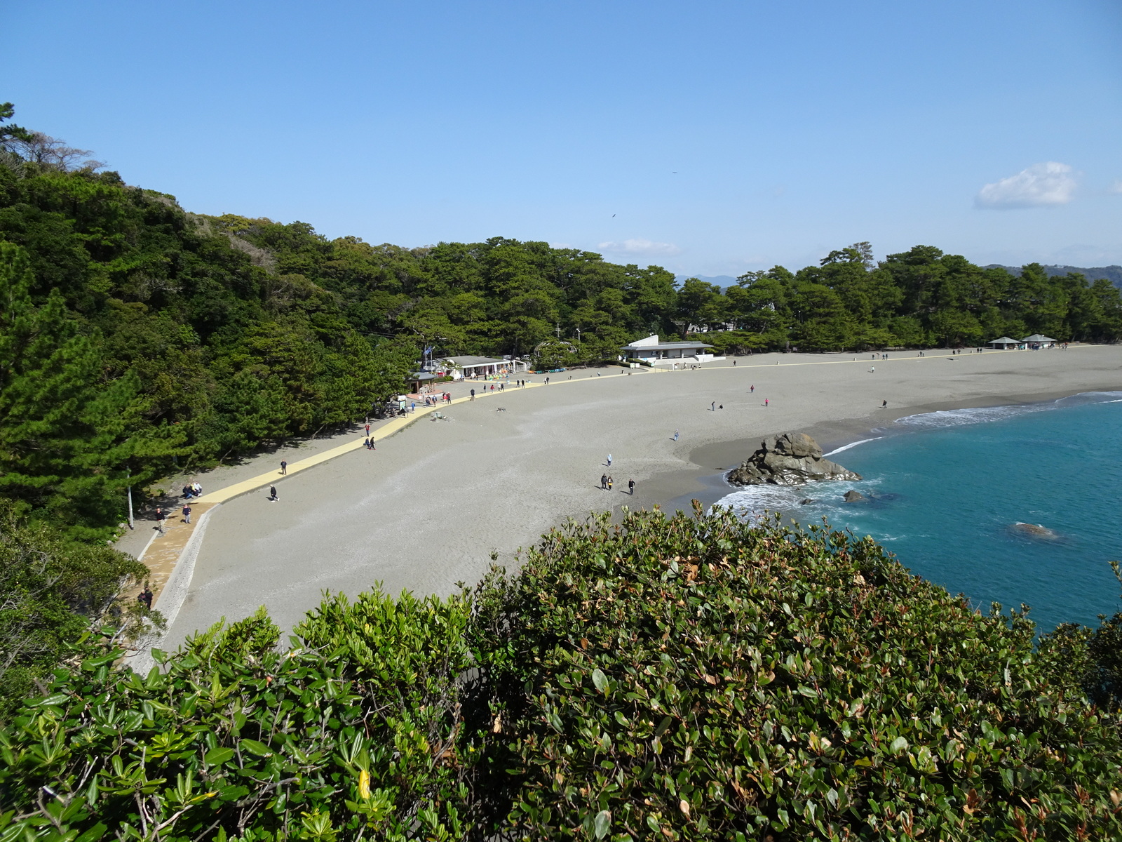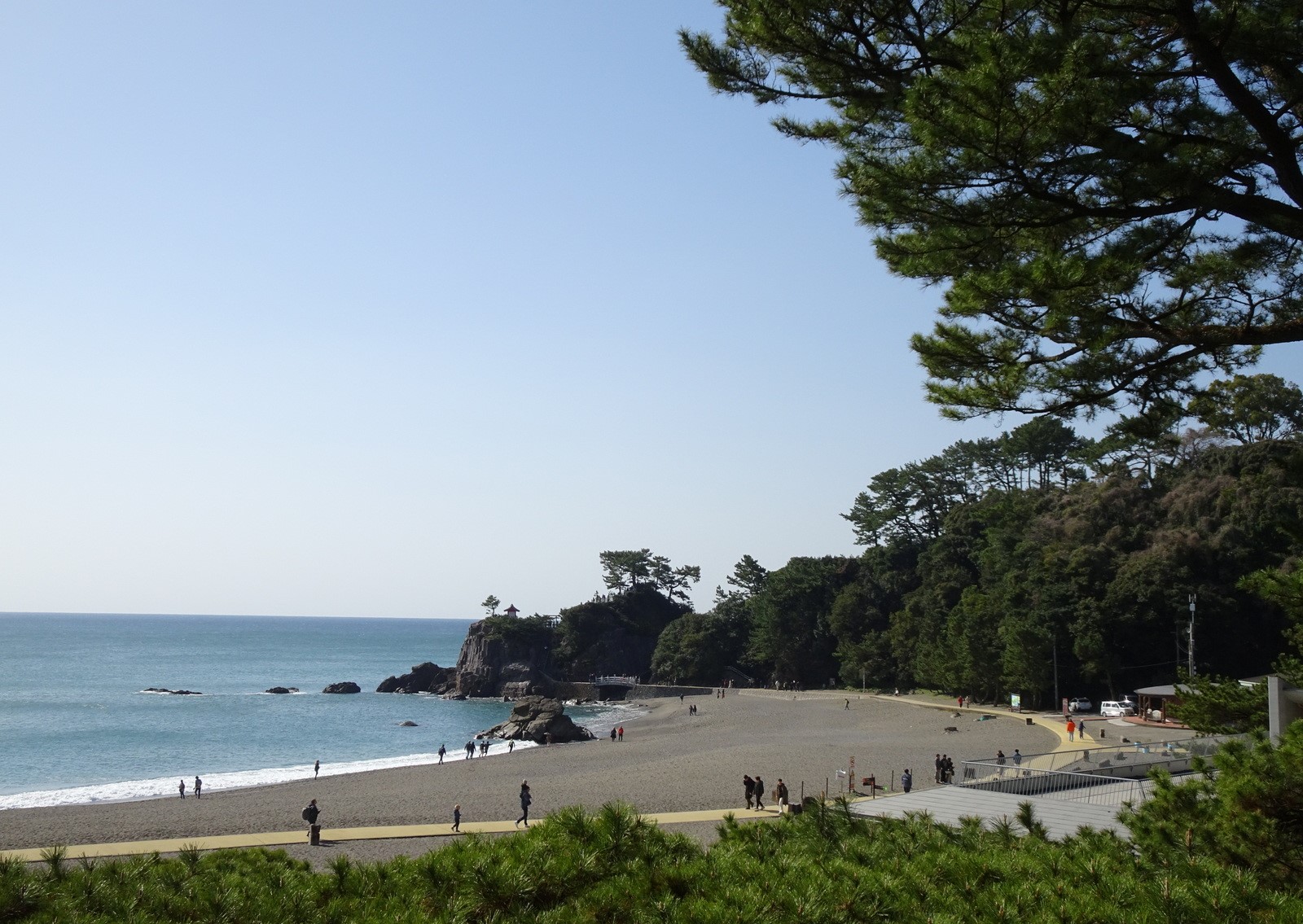 Kurze Fahrt zum Katsurahma-Strand. Halbmondförmig und angeblich unter den Top 100 Japans. Eingerahmt von felsigen Kaps und japanischen Kiefern liegt er nun vor uns, bzw. eigentlich unter uns, beschienen von der Morgensonne.