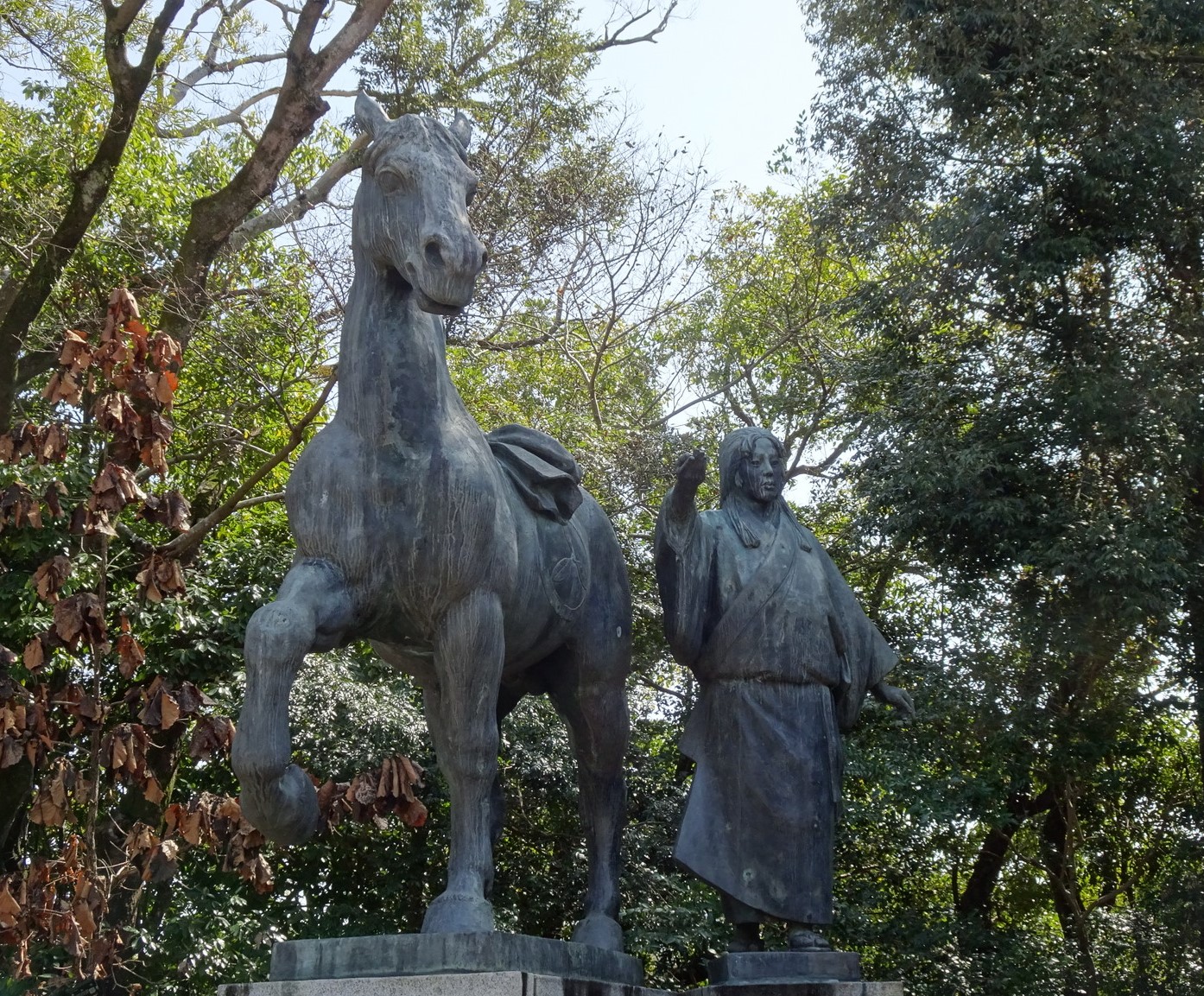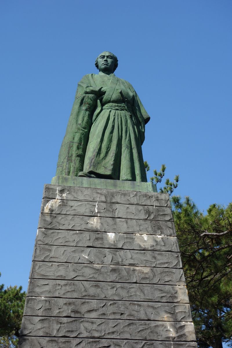 Bevor wir gleich nach unten in die Strandfreiheit entlassen werden, schauen wir uns noch in versammelter Gruppenstärke die Bronzestatue des berühmten und hier hochverehrten Sohnes der Stadt, dem edlen Samurai Sakamoto Ryoma an.