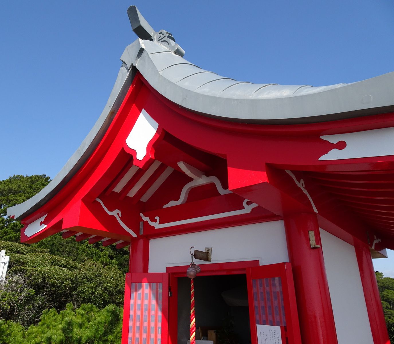 Schon bei der Einfahrt erkennt man auf der linken Seite den Katsurahma Strand und eine kleine weiße Brücke die zu einem Felsen führt, auf welchem das rote Dach eines noch kleineren Schreins/Tempels im frühen Sonnenlicht leuchtet.