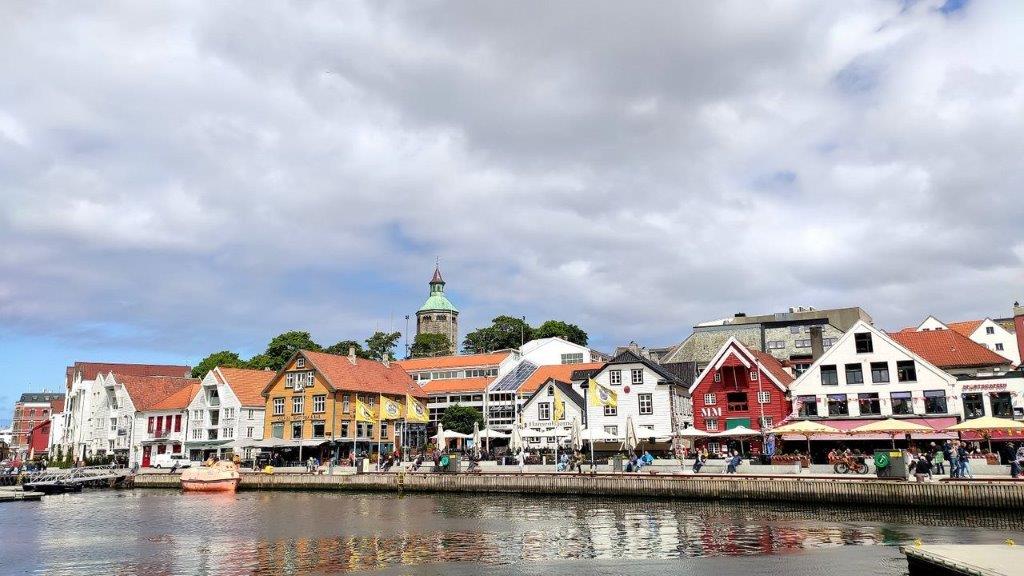 Herrlich, die älteren, sorgfältig renovierten Holzhäuser auf der gegenüber liegenden Hafenfront. In den guten alten Zeiten fungierten sie als Speicherhäuser. Wir erkannten es an den Ladeöffnungen im Giebel. Die Zeit des Ladens und des Lagerns ist vorbei – wie auch in anderen Hafengegenden lassen sich in diesen zu Restaurants umfunktionierten Gebäuden die Besucher verwöhnen. Diese Häuserzeile suchten wir auf. Aber nur kurz, denn wir wollten einen weiteren Überblick über Stavanger erhalten. Unser Ziel war der Valberget, ein fast 27 m hoher Wachturm.