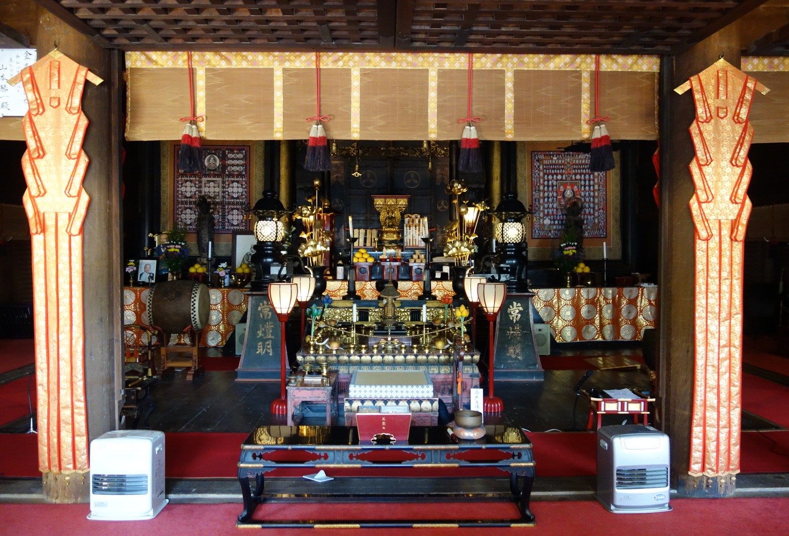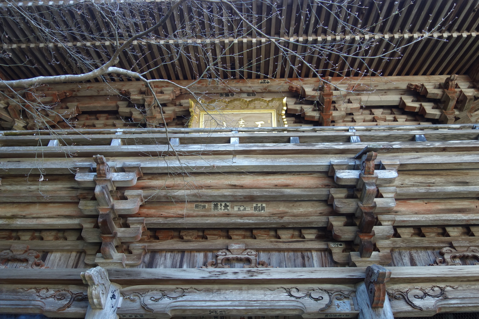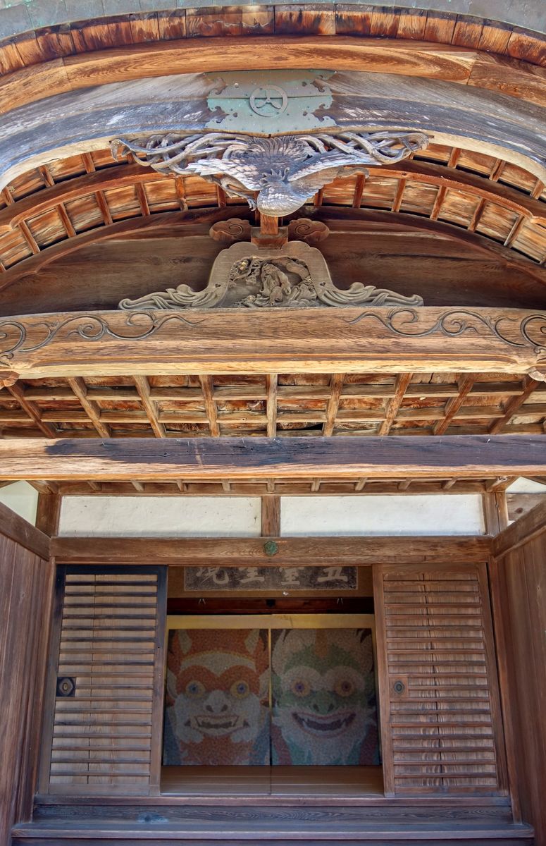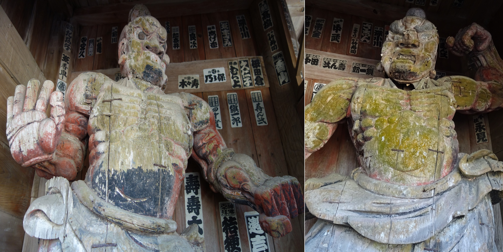 Das Tempeltor ist ein Turm mit Tempelwächtern und zur Blütezeit führt eine kleine Kirschbaum-Allee hinauf zur Haupthalle. Die hat einen quadratischen Grundriss und ist von einer Galerie umgeben. Verehrt wird der „Heilige Monju“ (ein Priester), begleitet von „Beschützern (Jisha)“. Und diese geschnitzte Truppe soll die älteste dieser Art in ganz Japan sein.