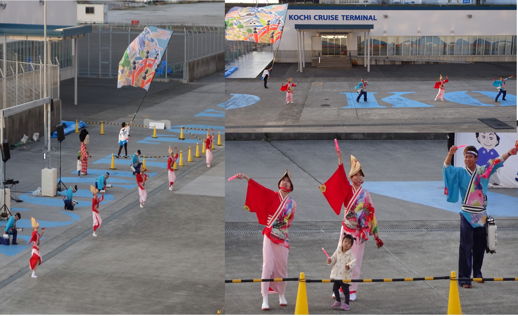 Zur Ausfahrt baut sich eine noch größere Combo als heute Morgen, bunt bekleidet vor uns an der Pier auf. Fahnen werden geschwenkt, effektvolle Tanzeinlagen zu japanischen Klängen.