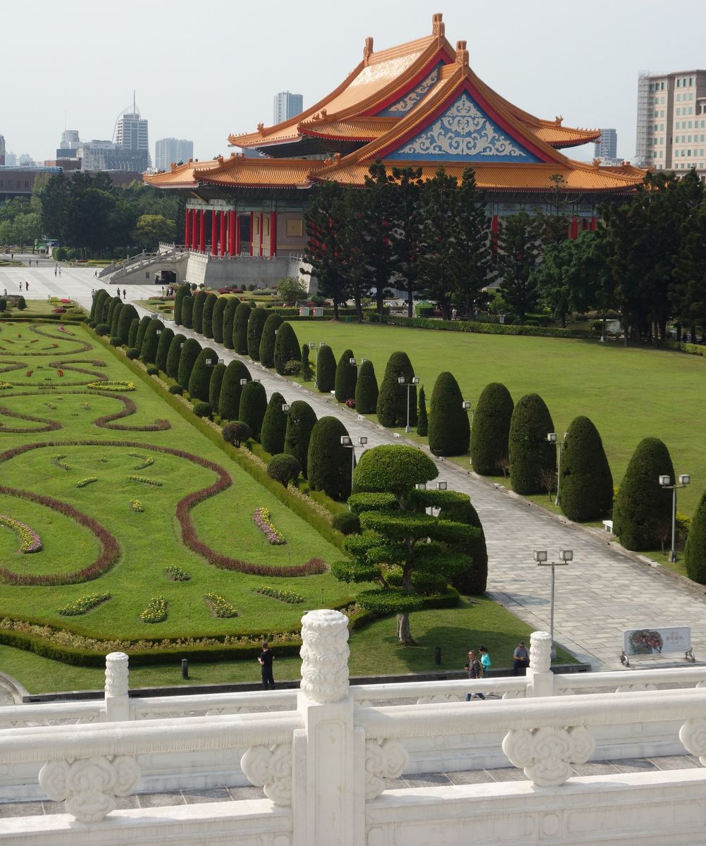 Das 70m hohe Dach ist mit blauen Glasziegeln gedeckt und schließt an der Firstspitze mit einer roten Kugel ab. Zusammen mit der weißen Fassadenfarbe und den roten Blumenbeeten sind es die Farben der „Republik China“. Also alles, selbst die Blumen hier, nicht zufällig so, nur weil es etwa schön aussieht wie der Tiger meint.