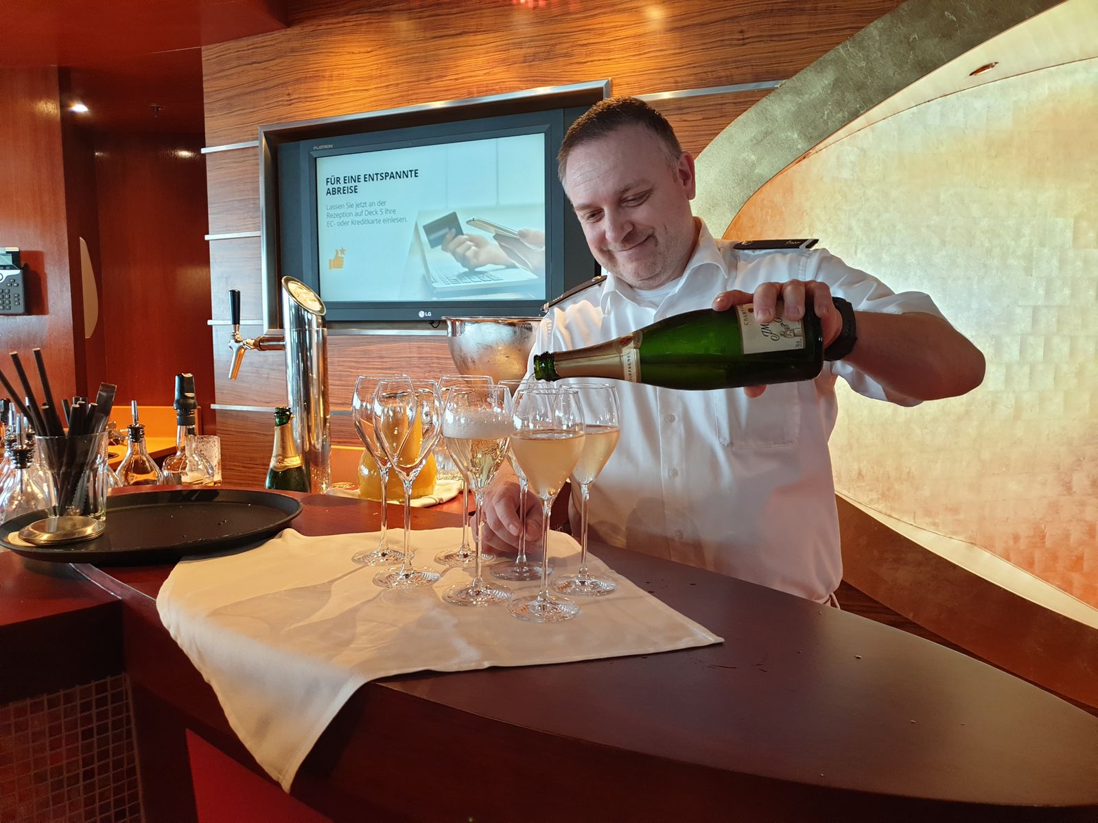 Auf Deck 11 wird gerade Champagner ausgeschenkt. Für wen? Für die Teilnehmer an der kulinarischen Brückenführung, die kurz vor 14 Uhr beginnt. Ich habe diese Veranstaltung im Februar auf der Stella mitgemacht und es war hoch interessant. Und welch eine Freude, es ist der gleiche Kapitän an Bord. Kurz unterhalte ich mich mit den Teilnehmern, bekomme auch ein Gläschen und wünsche ihnen einen tolle Tour dort in den heiligen Gemächern. Die Brückenführung ist echt empfehlenswert, denn wann kommt man schon dort rein und ist dem Kapitän so nah? Der kulinarische Teil der Tour ist ein Essen im Rossini an einem Tag der Wahl – allerdings ohne Kapitän. Zur Erinnerung gibt es ein hübsches Fotos mit Kapitän Tobias Wirsig, wie im Februar auch.