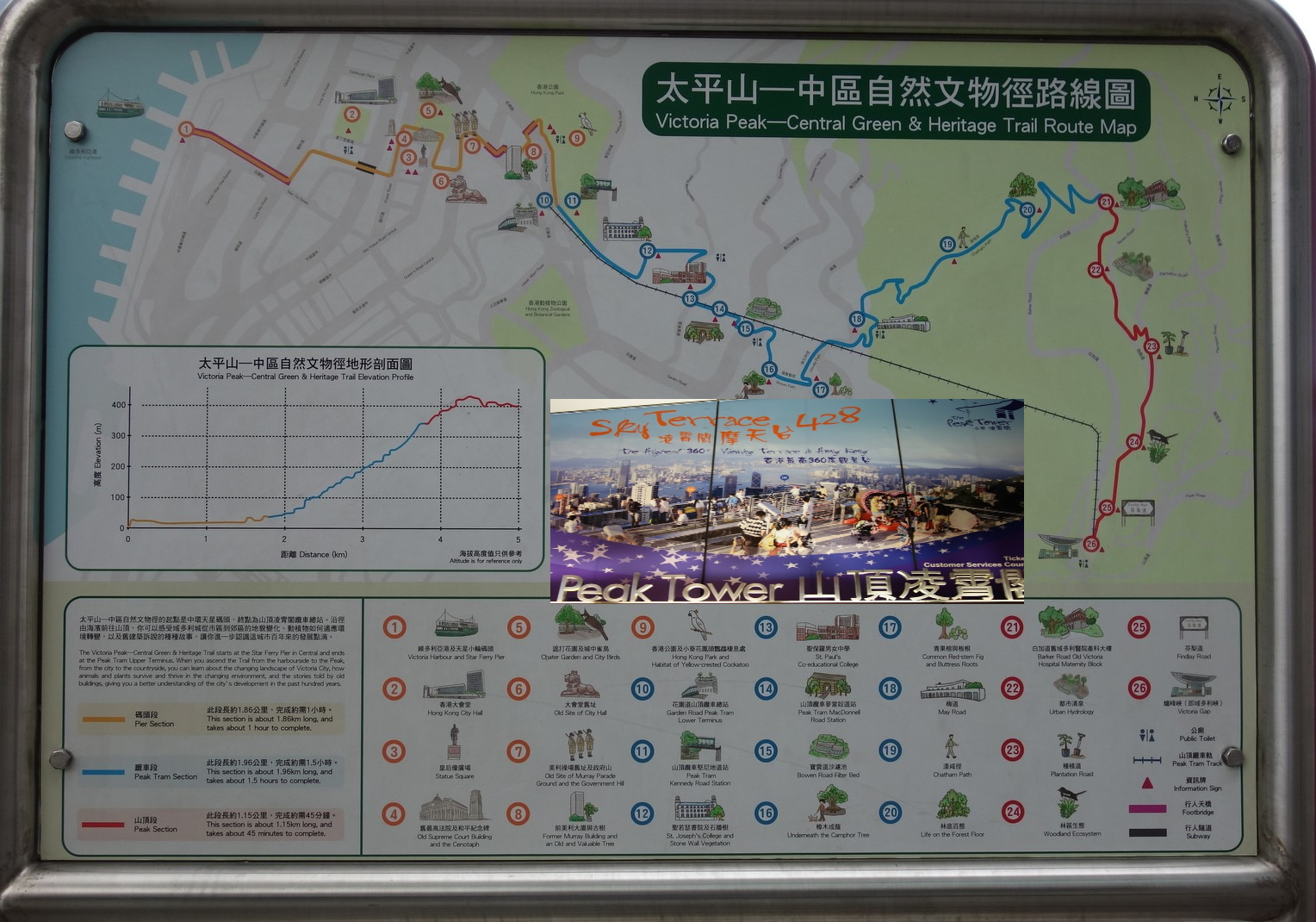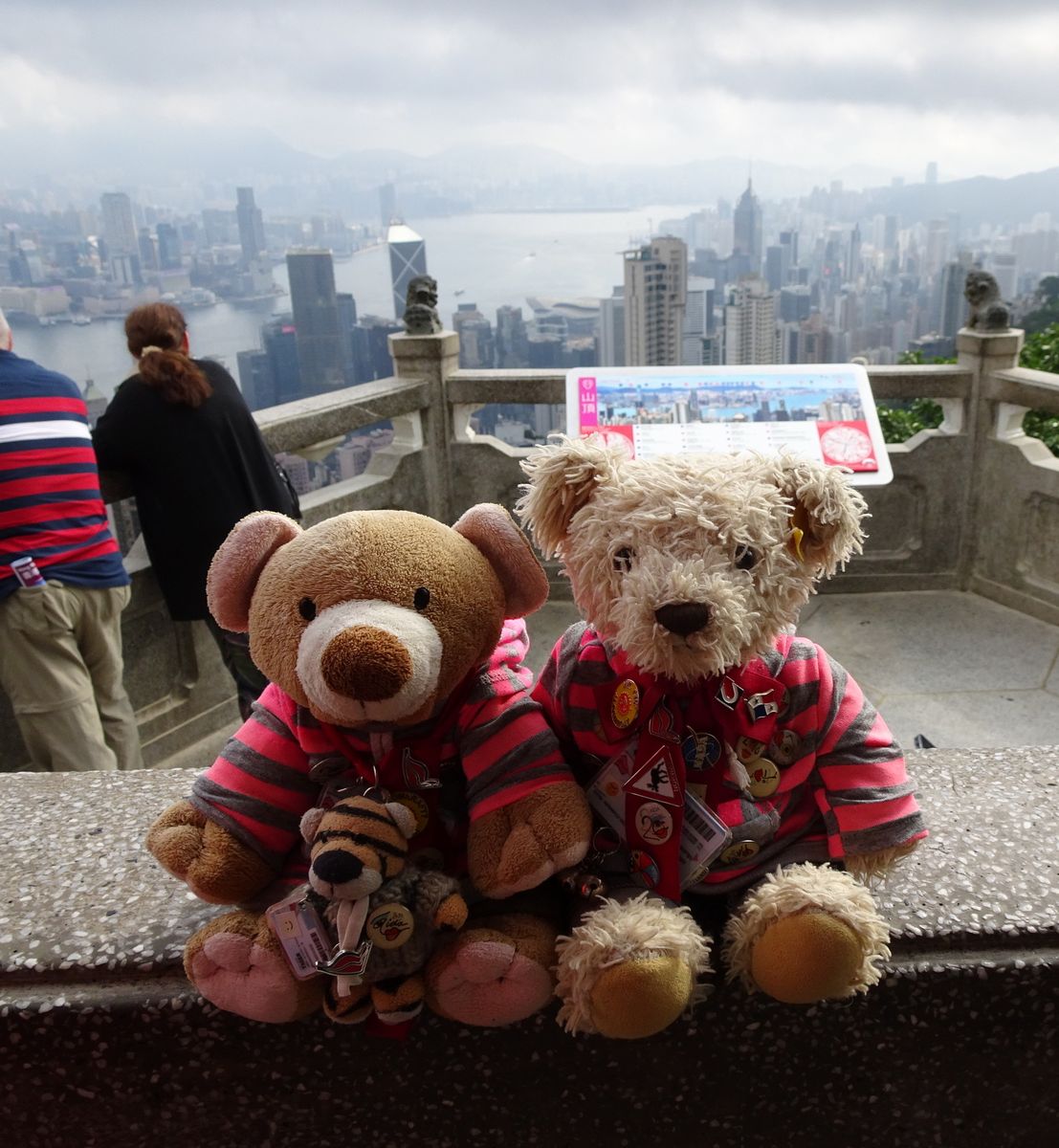 Der Bus schraubt sich mittlerweile die weitläufigen Serpentinen zum Victoria Peak hoch. Mit 552 Metern zwar nicht der Höchste, aber der, wie ich den anderen verspreche, bekannteste Berg Hongkongs. Und bekannt ist er, weil man von oben einen super Blick auf die Hafenbucht, auf Kowloon und weite Teile Hongkongs hat. Und dafür braucht man nicht bis auf den Gipfel, sondern nur zum Aussichtspunkt auf 379 m.