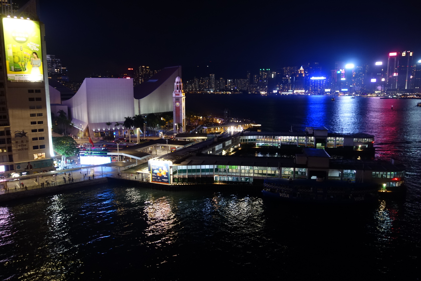 Ja, ein bisschen klarer könnte es sein. Aber okay, „nur Fotos mit blauem Himmel im Hintergrund sind ja auf die Dauer auch langweilig“, werfe ich mal wenig überzeugend zum „Schönreden“ in den Ring. Im Tageslicht jedenfalls trotzdem ganz klar zu erkennen: Unser Schiff und die alte geschäftige Fährstation, da unten rechts neben dem größten Wolkenkratzer, dem Finanzzentrum.