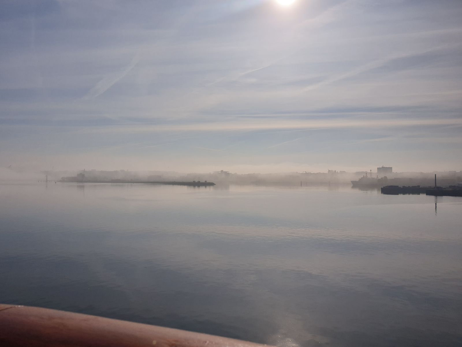 Komisch, heute werden wir alle früh wach, ist bestimmt die Aufregung vor der Abreise. Aber ausgeruht sehen wir nicht aus – brauchen wir etwas Erholung nach dieser Reise …?? Ich fange den Sonnenaufgang ein, es ist 6.34 Uhr. Die Heckwelle ist dezent und über dem Wasser liegt ein feiner Dunst.