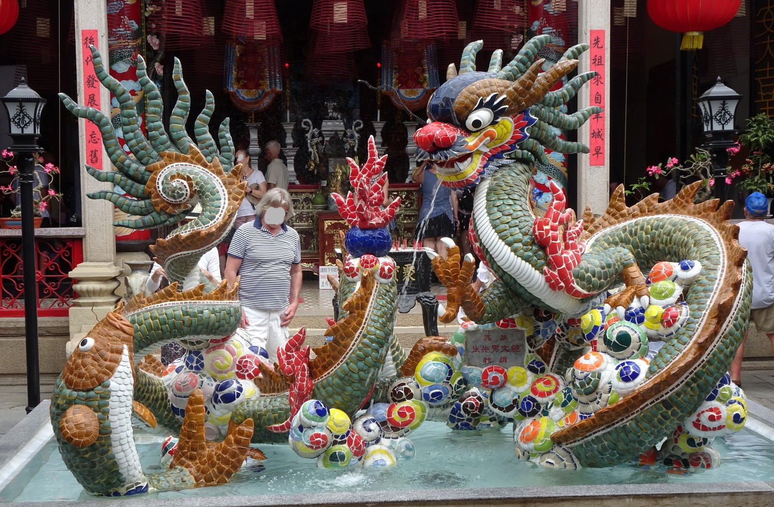 Das sieht man dann innen auch. Draußen begrüßt uns der Drache aus Mosaiksteinen in seinem Brunnen