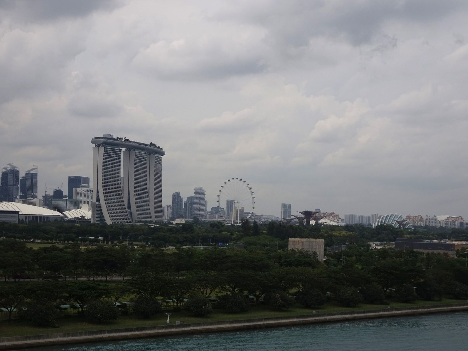 Doch irgendwie ist die Luft raus. Und diese Luft trägt ohnehin Entscheidendes dazu bei. Es ist drückend feuchtschwül und schon gestern Abend zeichnete es sich ab, -wir bleiben einfach an Bord. Schon die letzten Tage waren merklich "kleidungsintensiv". Noch den halben Tag auf eigene Faust durch die Hitze, dabei die Teddys auf dem Buckel. Wer will denn solche „Stinkbolzen“ im Flieger mitnehmen? Ist doch peinlich. Da geht es jetzt also hoch auf das nahezu menschenleere „Nackedeideck“, man will ja keine Klamotten mehr einsauen. Aussicht auf Marina Bay,