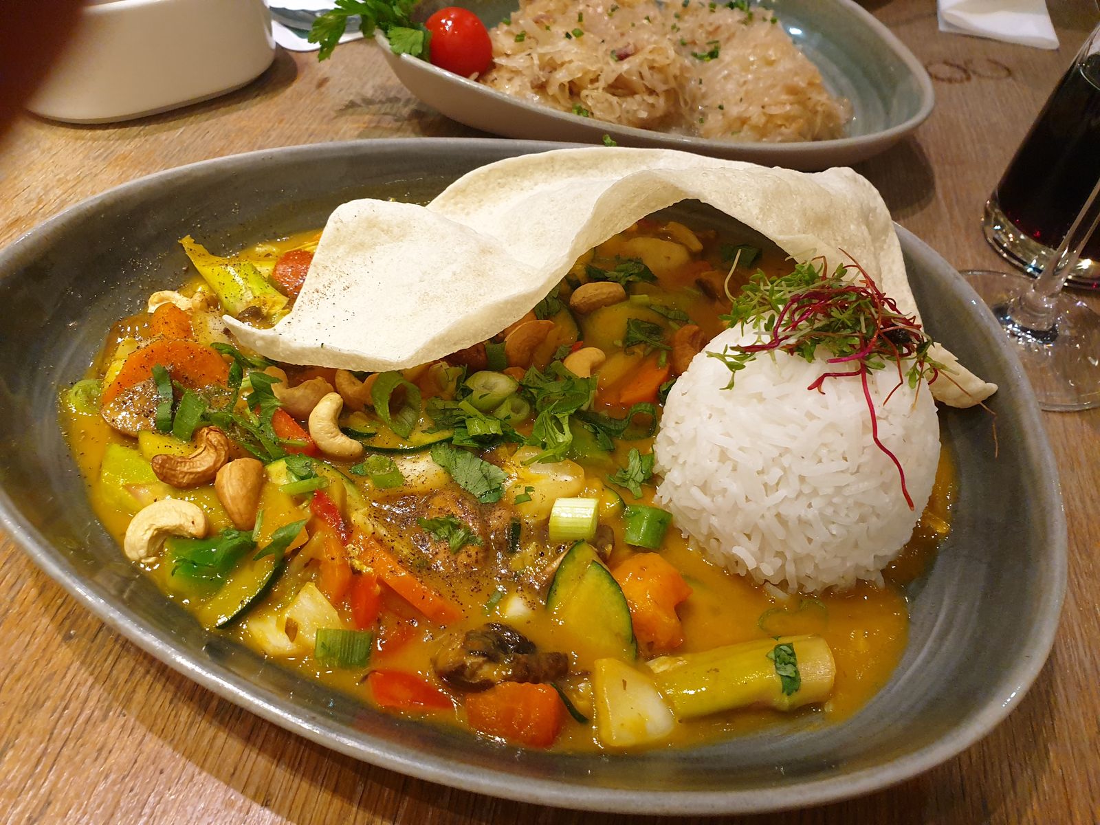 Herrlich, wir haben ausgeschlafen, nehmen anschließend ein Frühstück zu uns und schlendern mit den Gepäck an Läden vorbei und dann sind wir auch unseren Koffer los. Kurz überlegen wir, ob wir noch was essen sollen vor dem Abflug, denn ich denke mal, es wird kein warmes Essen an Bord geben. Und zur Einstimmung auf den Urlaub wähle ich ein feuriges Curry und mein Mann hat so richtig Lust auf einen Strammen Max und Sauerkraut dazu – Geschmäcker sind halt unterschiedlich.