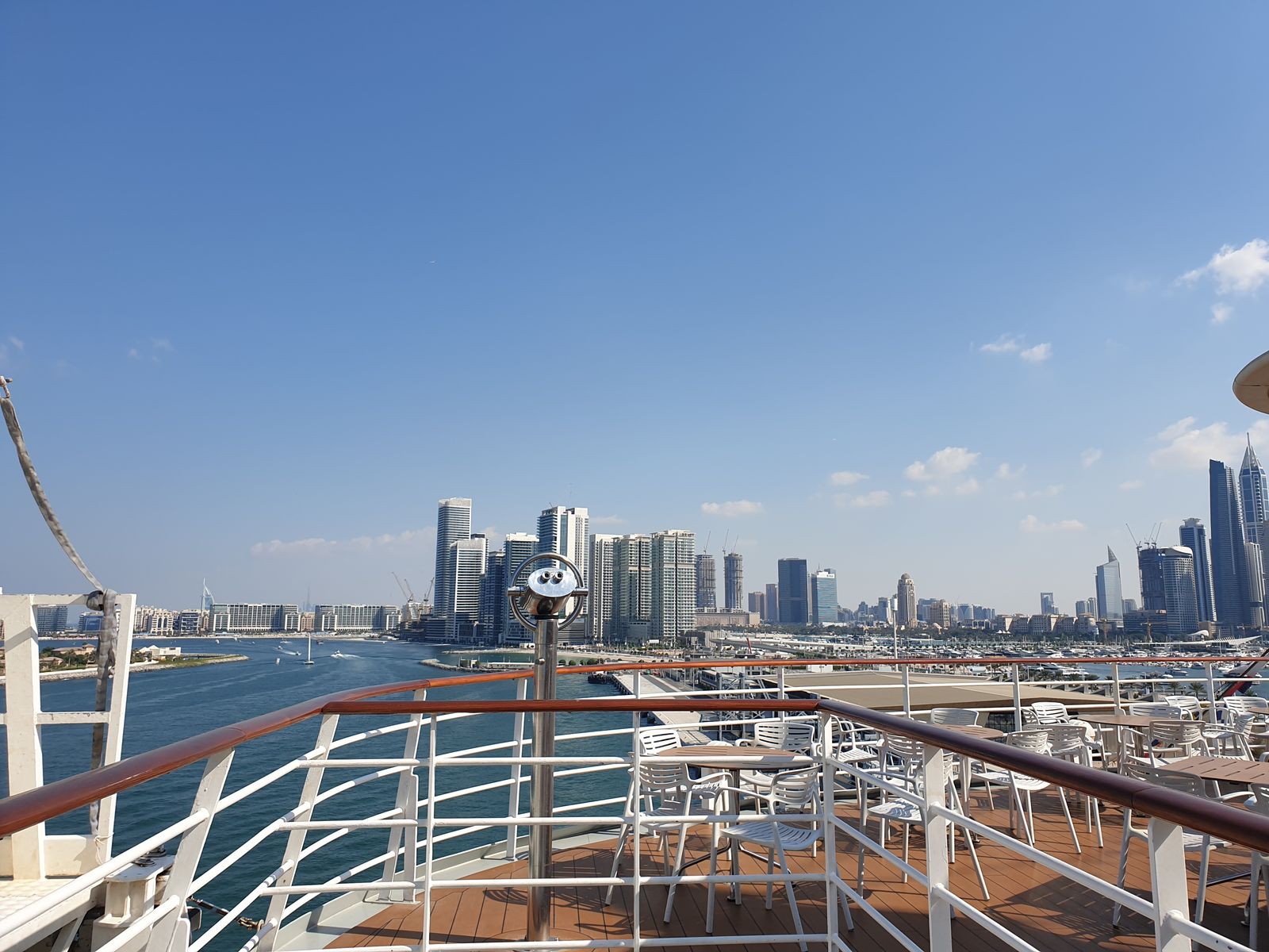 Alle Formalitäten sind erledigt und dann heißt es „Herzlich willkommen an Bord“. Zum Glück hatte ich mich beim Abflug in Frankfurt sommerlich gekleidet und kann vor der Ocean Bar ohne zu schwitzen, Platz nehmen und wir stoßen auf unsere Reise an.