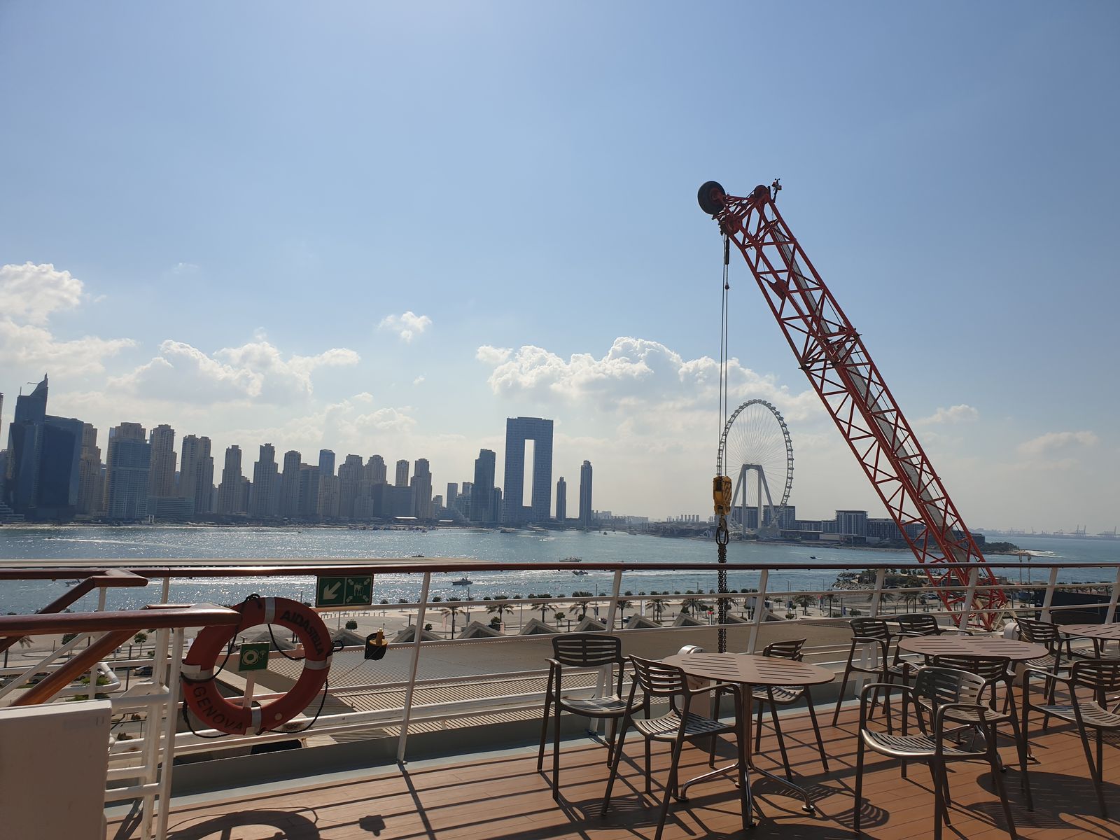 Der Abend ist lau und wir sitzen uns raus, vor der Ocean Bar und Dubai erstrahlt im abendlichen Glanz. Nicht zu übersehen das Riesenrad, das bunt leuchtet. Im Oktober 2021 wurde das höchste Riesenrad der Welt, 250 Meter hoch, eröffnet. Damit überragt es mit 82 Metern den High Roller in Las Vegas und ist ungefähr doppelt so hoch wie das London Eye. Eine Fahrt damit wäre sicher schön, aber wir haben uns vorgenommen, dass wir morgen einfach mal nichts tun, außer Balkon genießen und die Tag gemütlich vertrödeln.