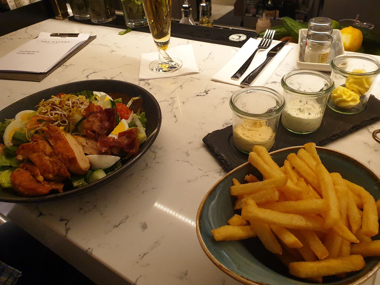 Herrlich, wir haben ausgeschlafen, nehmen anschließend ein Frühstück zu uns und schlendern mit den Gepäck an Läden vorbei und dann sind wir auch unseren Koffer los. Kurz überlegen wir, ob wir noch was essen sollen vor dem Abflug, denn ich denke mal, es wird kein warmes Essen an Bord geben. Und zur Einstimmung auf den Urlaub wähle ich ein feuriges Curry und mein Mann hat so richtig Lust auf einen Strammen Max und Sauerkraut dazu – Geschmäcker sind halt unterschiedlich.