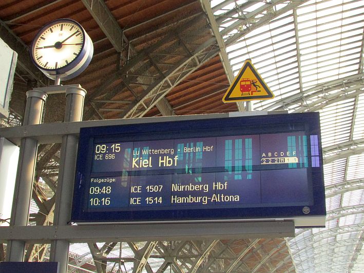 Inzwischen ist es kurz nach 10 und die große Halle des Leipziger Kopfbahnhofs liegt bereits etliche Kilometer hinter mir. Seit rund 45 Minuten sitze ich nunmehr im ICE und rolle meinem heutigen Ziel Kiel entgegen, wo ich in viereinhalb Stunden pünktlich ankomme. Hoffe ich zumindest, denn ich hatte ja schon so einige besondere "bahn-tastische" Abenteuer mit der Deutschen Bahn. Die S-Bahn hatte in Leipzig ein paar Minuten Verspätung, so dass ich mich auf meinem Weg vom City-Tunnel hinauf in die Bahnhofshalle ziemlich sputen musste. Der ICE stand bereits abfahrbereit am Bahnsteig. Natürlich befindet sich mein in der 1. Klasse reservierter Platz genau am anderen Ende - bzw. in dem Fall - am Anfang des Zuges. Nochmal einen Spurt einlegen. Die vier Rollen meines großen Koffers beginnen fast zu glühen.