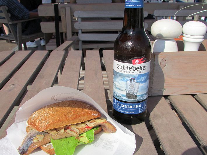 Meine Wahl fällt auf Goldrauchmatjes im Mais-Brötchen, garniert mit geriebenem Holsteiner Apfel und knackigem Salat. Dazu ein kaltes, süffiges Störtebeker-Pils. Tut DAS gut, wenn der kühle Gerstensaft die Kehle hinunterrinnt. Eine Weile ruhe ich mich aus, genieße die Atmosphäre. Ich beobachte die Möwen, die aber komischerweise die Gäste gar nicht belästigen, sondern respektvollen Abstand halten.