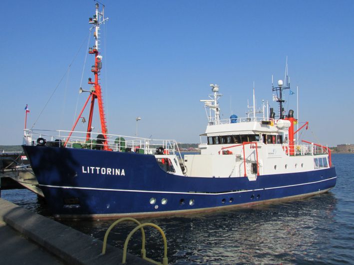 Bei der institutseigenen "Littorina" mit Baujahr 1975 handelt es sich um ein in Ost- und Nordsee bis hinauf nach Norwegen im Einsatz befindliches Forschungsschiff der Universität Kiel. Direkt am Anleger des Helmholtz-Instituts ist es zu finden.
