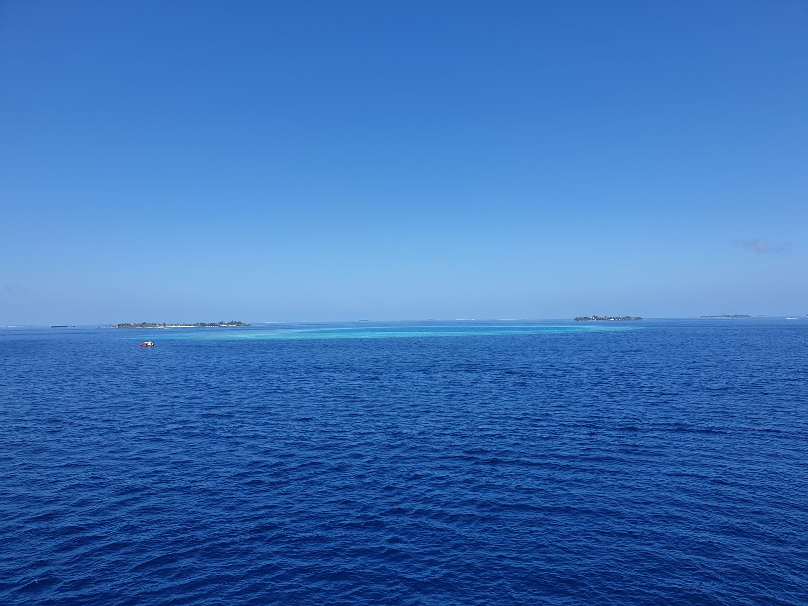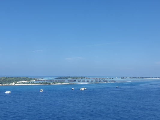 Wir haben uns achtern einen Platz gesucht und schauen auf das überirdisch blaue Meer. In der Ferne tauchen die ersten Atolle mit den Bungalowanlagen auf. Es gibt dort im indischen Ozean 26 ringförmige Atolle, die aus mehr als 1.000 Koralleninseln bestehen. Und weil die Korallen weiß sind, sorgen sie auch für die türkisgrüne Färbung des Wassers rund um die Atolle.