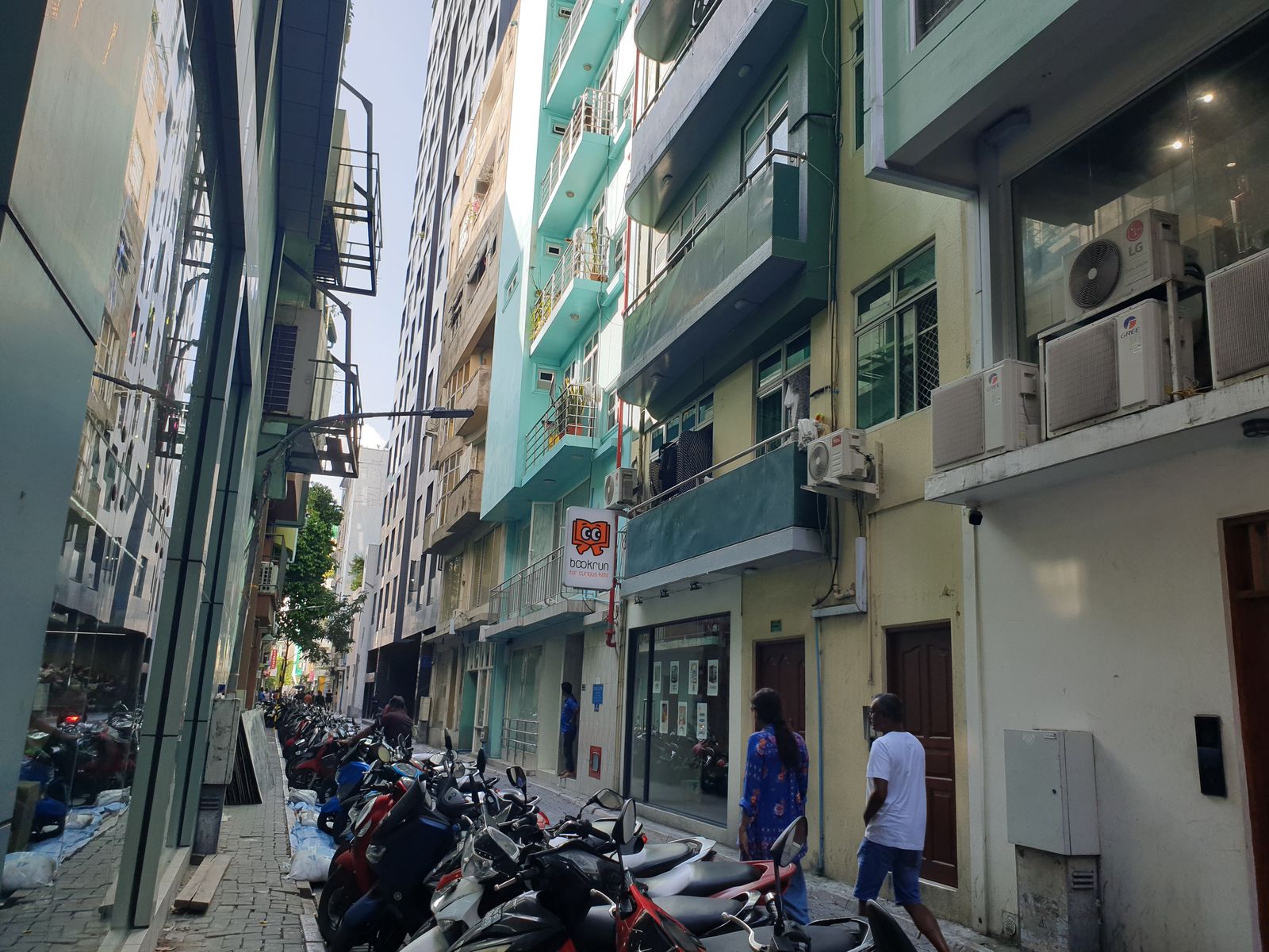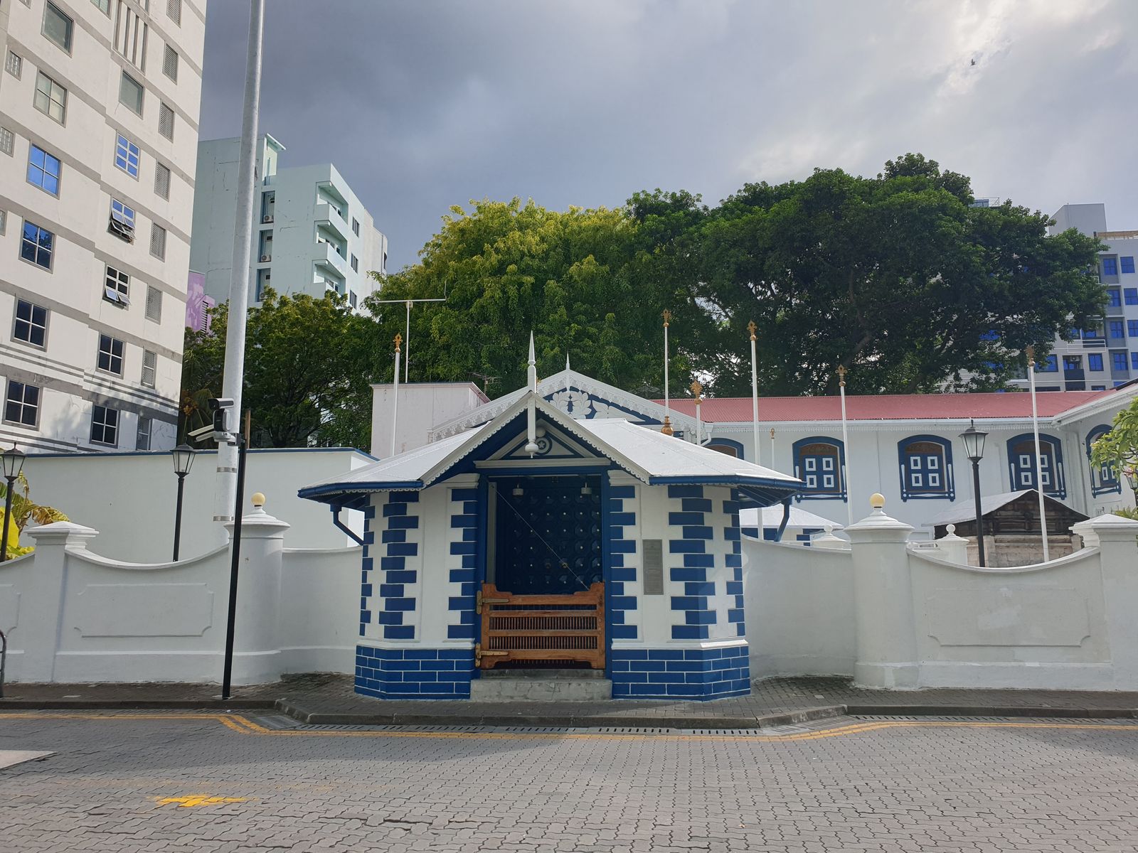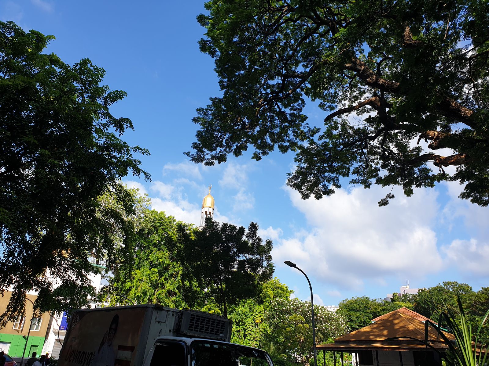 Wir laufen kreuz und quer, schauen in schmale Straßen und sind angetan von der rücksichtsvollen Fahrweise der Motorroller- und Autofahrer. Zwischen dem Geäst eines Baumes sehe ich das schlanke Minarett der größten Moschee der Malediven.