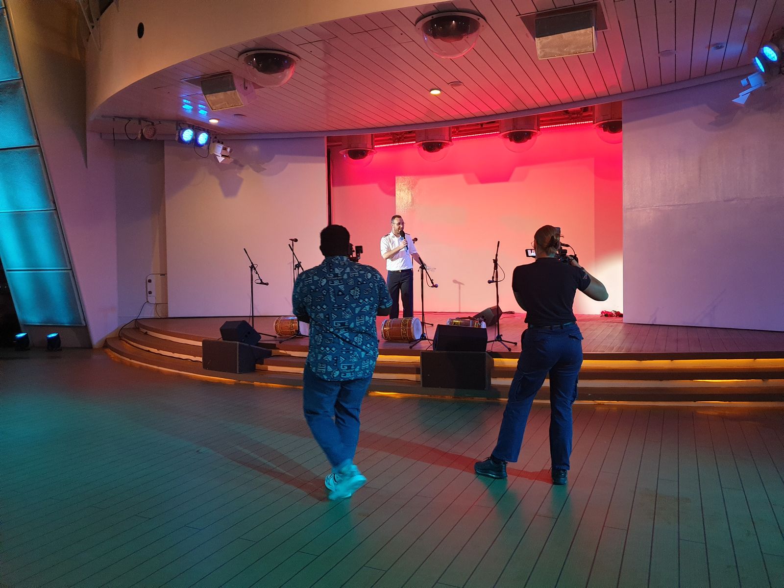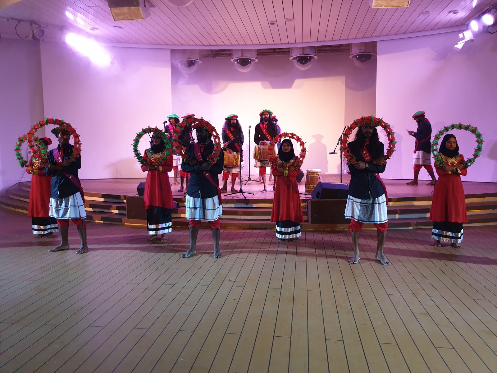 Nach dem Abendessen wartet auf dem Pooldeck eine Überraschung für die Passagiere. Lokale Gastkünstler aus Malé tanzen und singen nach traditioneller Musik. Ich sehe die Kameramänner, die den Auftritt der Gruppe filmen werden.
