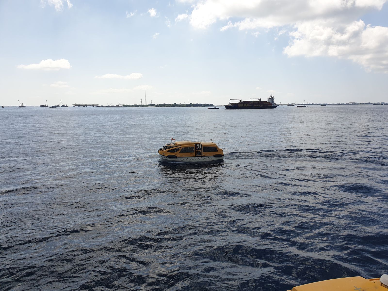 Gegen 13 Uhr erreicht die Stella ihren Reedeplatz für Malé und die Rettungsboote werden zu Wasser gelassen. Stündlich verkehren sie zwischen dem Hafen dort und dem Schiff.