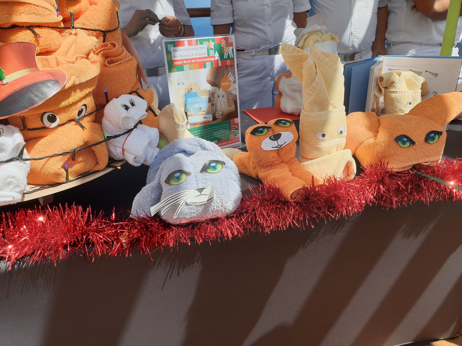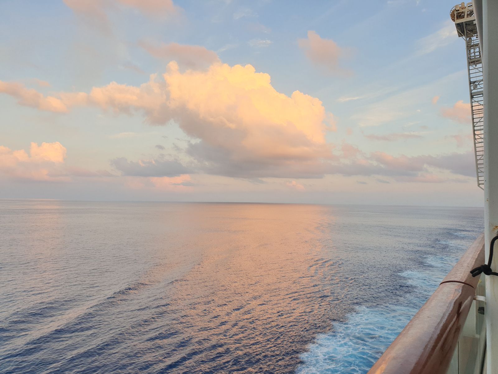 Ich wache auf und denke, wären wir zu Hause, würde jetzt Weihnachtsmusik im Radio laufen, es ist der 2. Advent. Hier auf der Stella wird es heute auch Adventsstimmung geben. Ab 10.30 Uhr öffnet der Weihnachtsmarkt, habe ich gelesen. Nun aber zum Jetzt. Es ist ein Erlebnis, wenn das Schiff auf dem Weg nach Malé ist. Um kurz vor 5 Uhr ist der Himmel noch rabenschwarz und da ich Sterne schauen liebe, stehe ich auf dem Balkon und erkenne den Orion. Eine halbe Stunde später wird der Himmel langsam hell, das Morgenrot ist im Anmarsch. Auf dem Fernseher kann ich die Heckwelle anschauen und die Temperatur ist schon ordentlich …. Das Meer glänzt sanft rosa und das sind Momente, die in der Erinnerung hängen bleiben.
