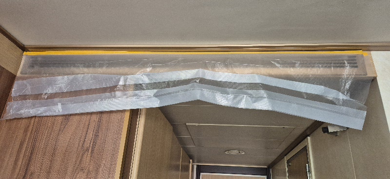 Nachdem ich voriges Jahr noch einen Schal in die Schlitze gestopft habe, den ich extra dafür mitnahm habe ich mich weiterentwickelt und im Baumarkt eine Maler Abdeckfolie mit integrierten Klebeband besorgt. Das sollte theoretisch besser funktionieren, da ich damit die Schlitze nicht verstopfe. Ob es eine gute oder blöde Idee ist, dazu gebe ich später einmal noch ein Update.