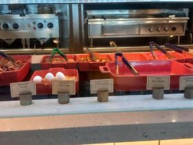 4) Und dann gibt es das System auf der Vasco da Gama: es ist eine Mischung aus allen dreien: Es gibt viele Stationen an denen das Essen dann vom Personal ausgegeben wird, 2x Salat, Brot, Obst, vegetarisch, gegrilltes, geschmortes, Eintöpfe, WOK Nudeln (wird frisch zubereitet und man bekommt einen Pager), etc.
