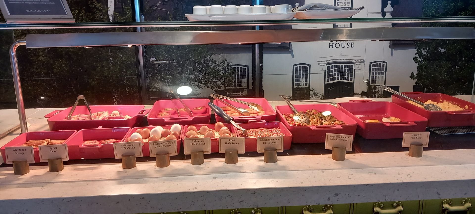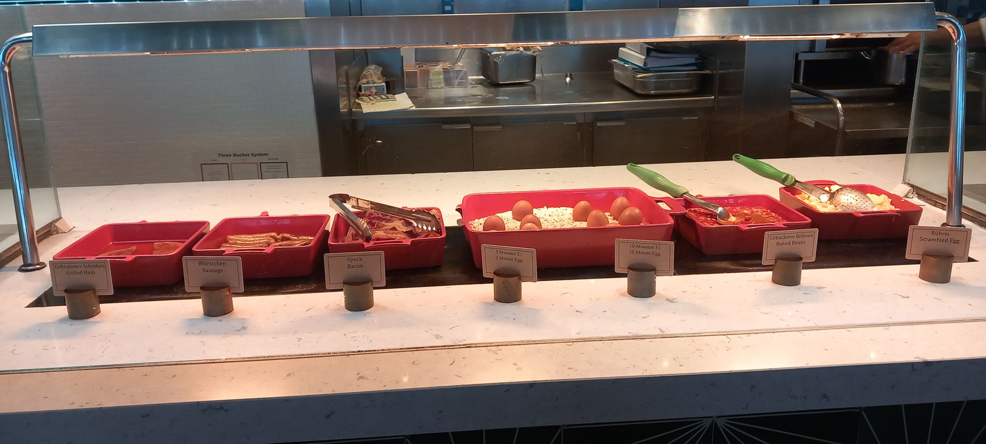 4) Und dann gibt es das System auf der Vasco da Gama: es ist eine Mischung aus allen dreien: Es gibt viele Stationen an denen das Essen dann vom Personal ausgegeben wird, 2x Salat, Brot, Obst, vegetarisch, gegrilltes, geschmortes, Eintöpfe, WOK Nudeln (wird frisch zubereitet und man bekommt einen Pager), etc.
