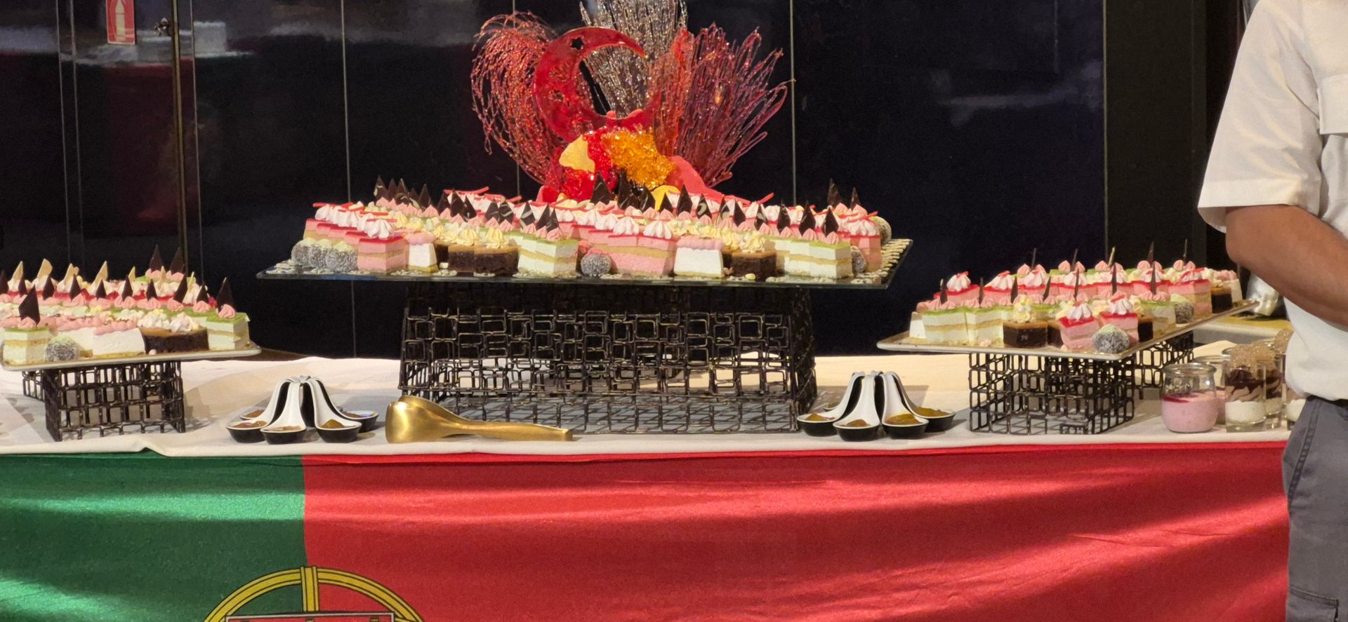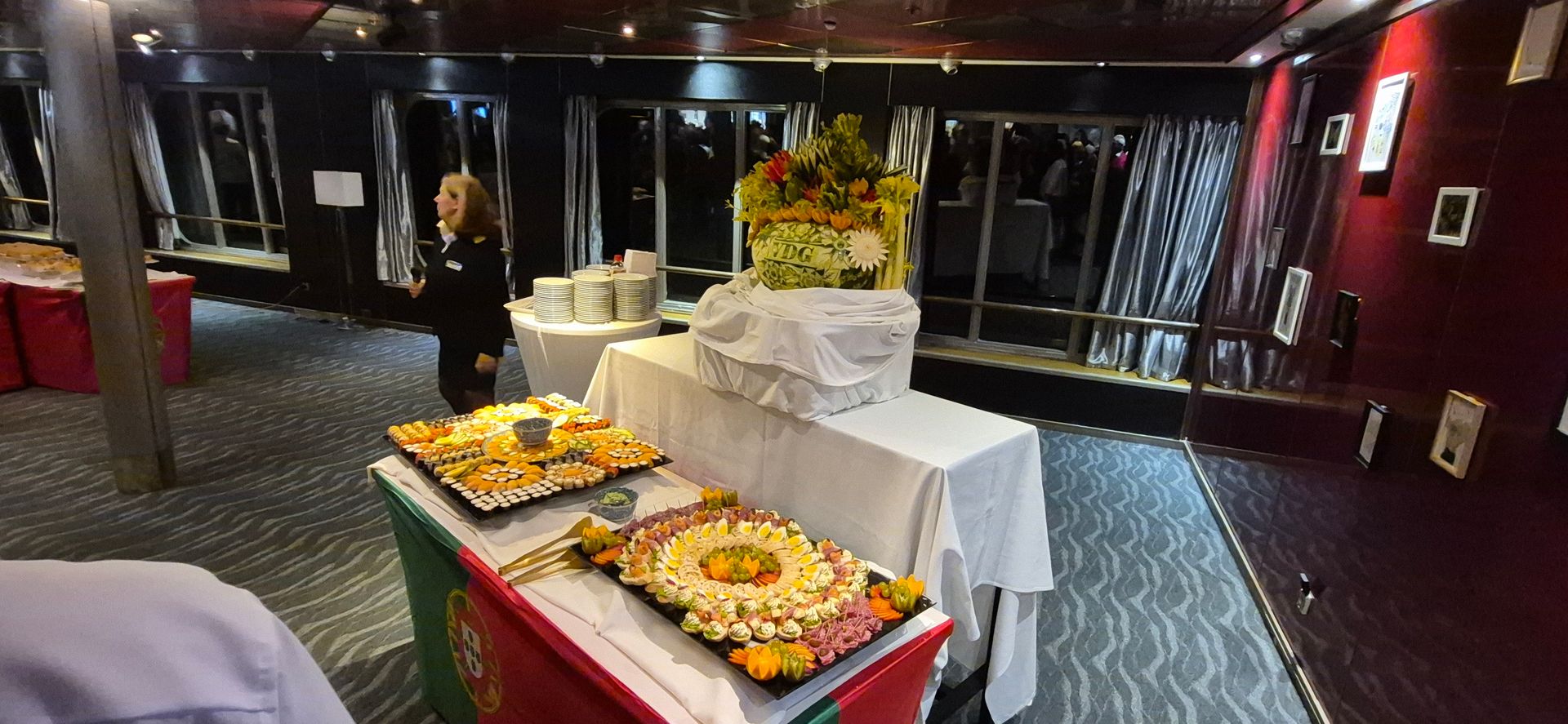 Um 21:45 gibt es ein großes Buffett, zusätzlich zum normalen Speisenangebot, damit niemand verhungern muss. Die Crew gibt sich viel Mühe und es schaut wirklich gut aus. ABER: man stelle sich einen Lebensmittel Transporter am Gaza Streifen vor der gerade geöffnet wird, genau so geht es nach Eröffnung zu, unvorstellbar. Wir kennen das schon und verzichten, wir sind klein und haben Angst zertrampelt zu werden 🙂