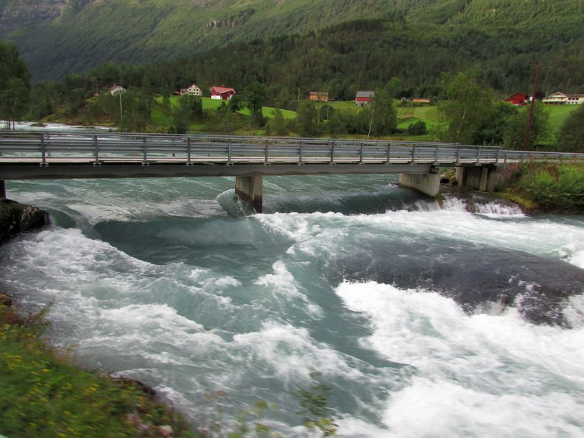 Hinter Loen beginnt das Lodalen, eine ebenso schöne wie auch mit zwei tragischen Naturkatastrophen verbundene Gegend. Die Jahreszahlen 1905 und 1936 haben sich sicherlich genauso tief ins Bewusstsein der Einwohner dieser Gegend eingebrannt wie der Name eines Berges: Ramnefjell. Doch dazu später mehr. Im Moment genießen wir einfach die Fahrt vorbei an einer Kulisse atemberaubender Natur mit massiven Felsen, üppig blühenden Sommerwiesen und einem wild rauschenden Bach, gespeist vom Schmelzwasser des Jostedalsbreen.